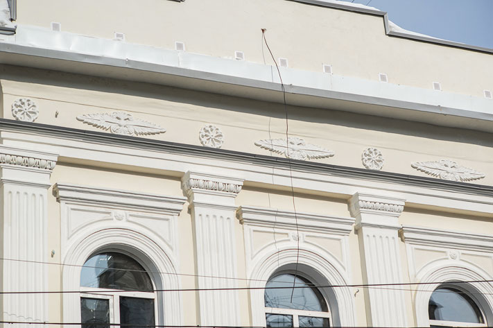 Кроме внутренней отделки, она затронула и внешний вид здания — особняк решено было освежить за счет перекрашивания. Цвет фасада согласовали буквально в последний момент — оставлять его голубым не хотелось. Решили остановиться на нейтральном