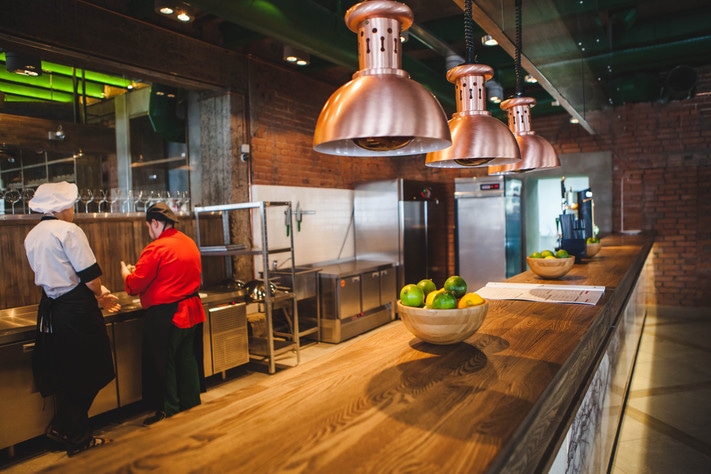 Особая гордость владельцев — открытая кухня в центре ресторана: