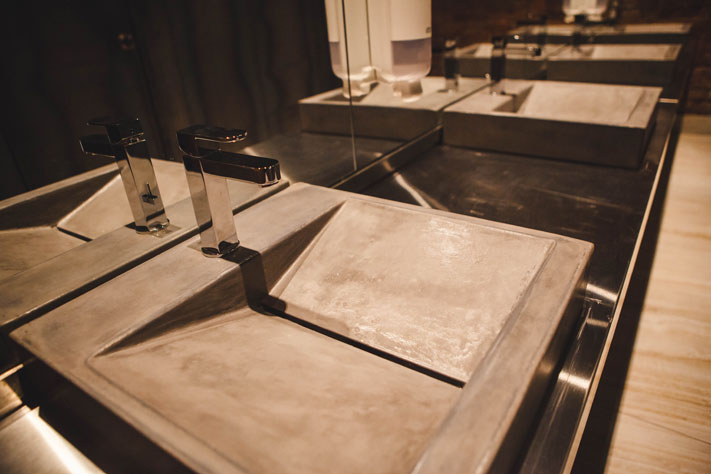 Удобная, качественная и недешевая мебель — стоимость только одного дивана, стоящего на первом этаже, составляет порядка 240–260 тысяч рублей. Активно использован бетон — он не только выступает в качестве потолочного или полового покрытия, из него сделаны даже раковины в туалетных комнатах: