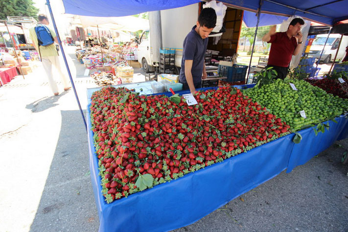 Мы посетили такой понедельничный базар в Анталии. Разница с ценами в магазине — в 2–3 раза. Ни разу не успели помыть клубнику — всегда съедали прямо так. И никакого вреда здоровью:) Сложилось ощущение, что здесь продают ее только что сорванную, потому что выглядела она бесподобно, а через полдня после покупки становилась «мятой». Продают ее прямо с прилавков, безо всяких холодильников.