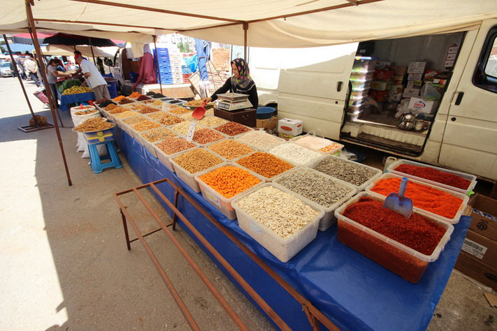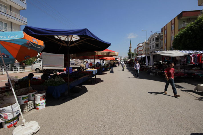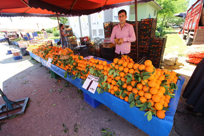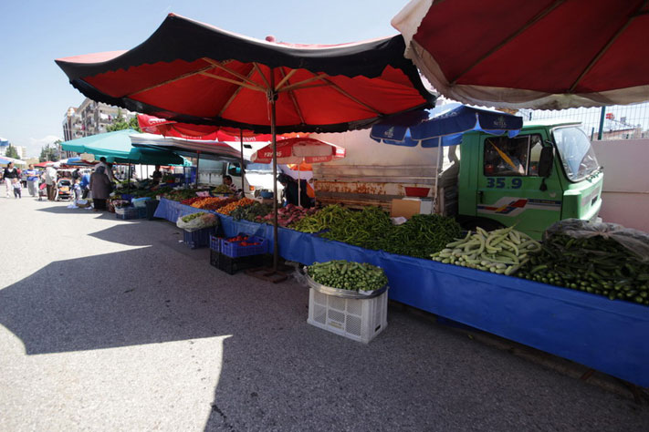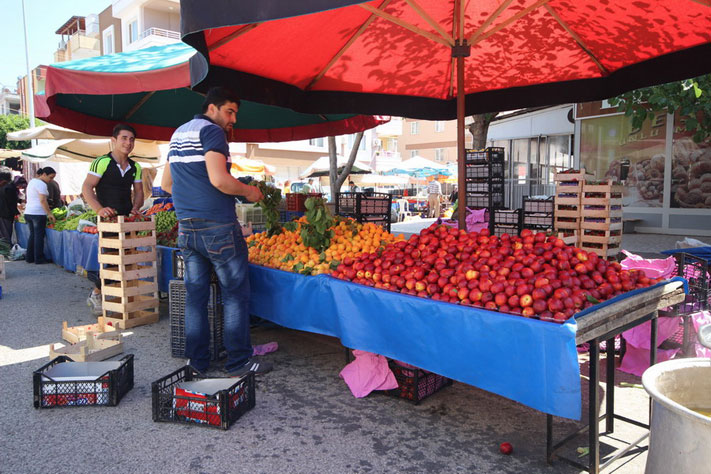 Посещение воскресных гуляний натолкнуло на мысль о базаре в Анталии. Гугл подсказал интересную особенность формирования торговых мест в Анталии и на побережье — базары работают в разных местах по одному дню недели. В Анталии — комбинированные, а в прибрежных городках по одному дню работают овощные привозы. Для организации торговли просто перекрывают пару улиц, а торговцы монтируют прилавки и навесы.