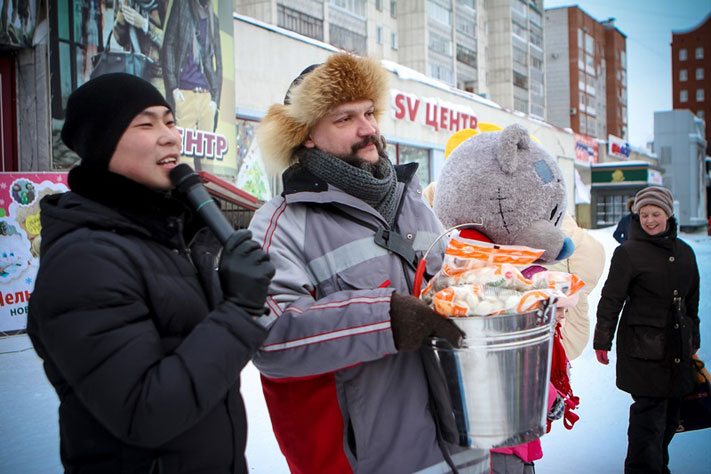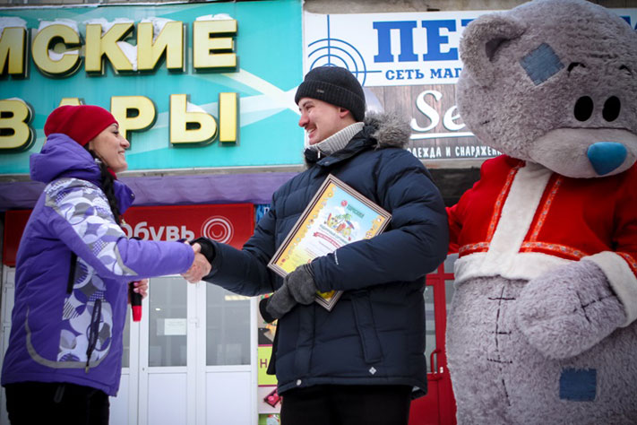 Главный герой «Пельменодня» Пельмеш Мяснович объявил победителей сразу двух конкурсов и вручил призы. На протяжении всего декабря участники конкурса «Новогодний замес» рисовали, шили, лепили игрушечные пельмешки и создавали композиции из пельменей «Свинокомплекс «Томский». И вот победителем стала семья Савиных, которая и получила главный приз — огромное и тяжелое (о чем свидетельствовала внезапно оторвавшаяся ручка) ведро пельменей.