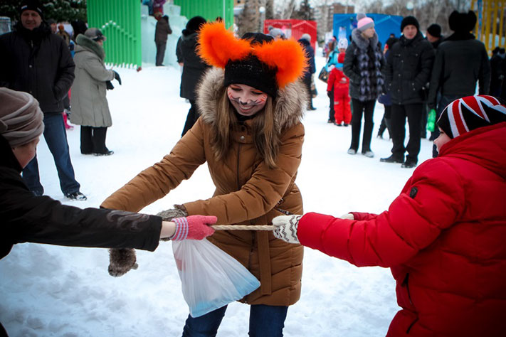 Перетягивание каната, как излюбленный конкурс на всех массовых гуляниях, и в этот раз никого не оставил равнодушным. Ребятишки вдоволь навалялись в снегу и посмешили всех окружающих.