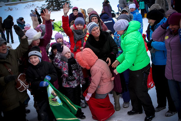 Забеги на «командных лыжах» пришлись по нраву всем участникам. Если выбирать самый шумный конкурс, то это был именно он, потому что ничто не доставило большей радости детям, чем совместное шагание на огромных лыжах.