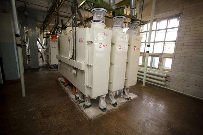 Из элеватора согласно помольной партии зерно уходит на мукомольный завод. На «Томских Мельницах» таких заводов три: на двух изготавливают пшеничную муку, на третьем — ржаную.