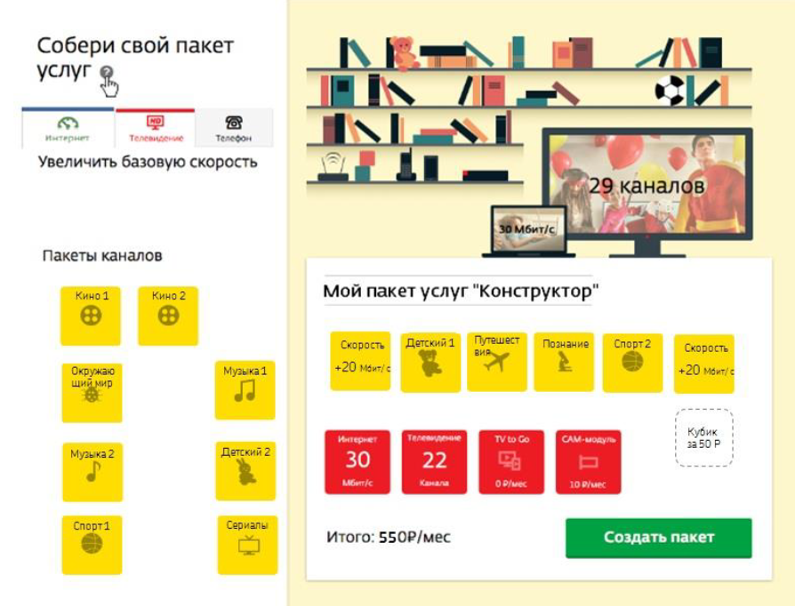 Изначально доступно 5 «кубикомест», из которых 2 сразу заняты «кубиком» скорости 30 Мбит/с для интернет и «кубиком» 29 каналов кабельного и эфирного телевидения. Еще 3 «кубика» можно выбрать самостоятельно — каждый из них является либо опцией для повышения скорости сети (2 «кубика» по +20 Мбит/с), «кубики» с кабельными каналами, объединенными по темам — спортивные каналы, детские, познавательные, кино и другие. Так же есть «кубик» для подключения