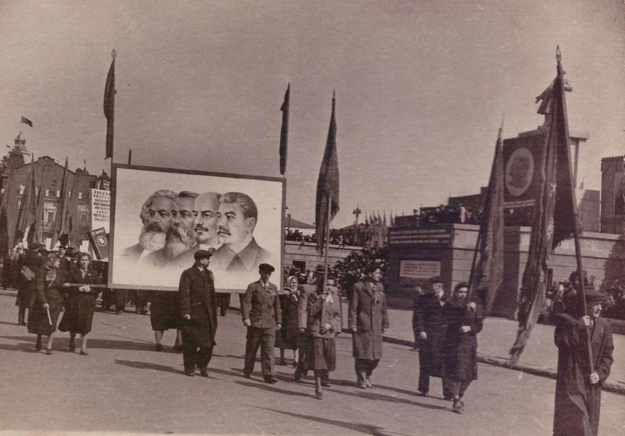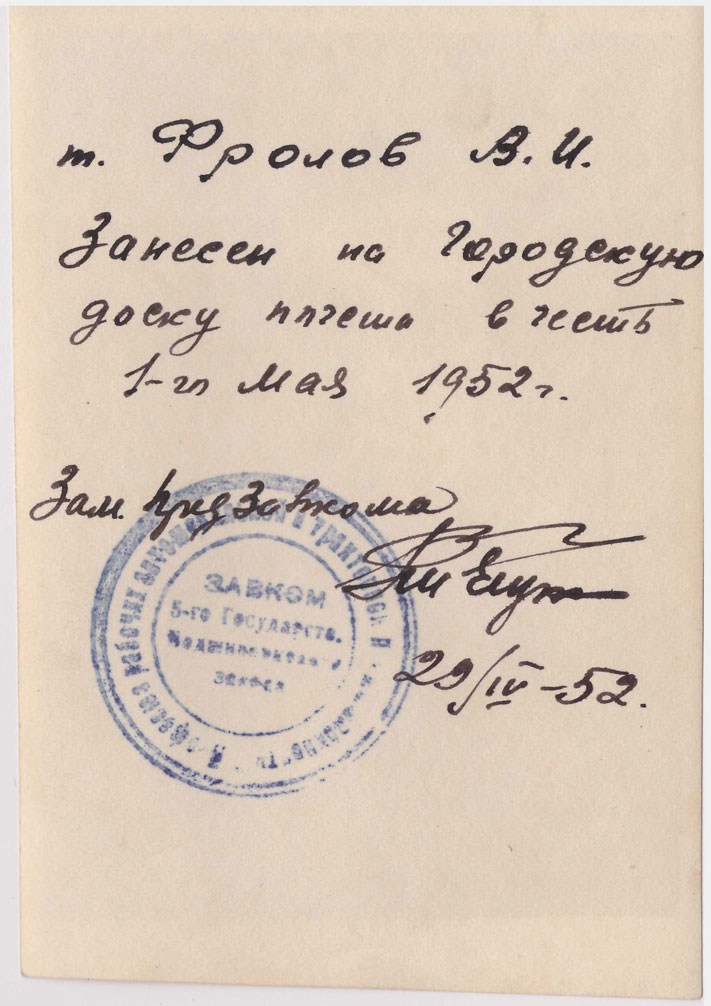 На этом фото 1951 года В. Фролов с коллегами возглавляет колонну ГПЗ-5 на Первомайской демонстрации. На обороте фото подписаны следующие фамилии и инициалы:
