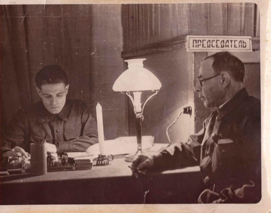 На третьем снимке — Председатель избирательной комиссии Д. В. Четвериков (с 1945 по 1948 г. — председатель заводского комитета) и заместитель председателя комиссии С. Шварц в клубе ГПЗ-5: