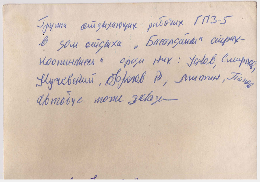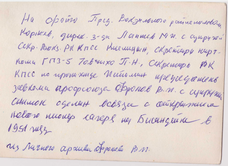 На фото 1951 года запечатлен заезд в пионерский лагерь. На переднем плане — секретарь комитета ВЛКСМ ГПЗ-5 В. И. Гредасов:
