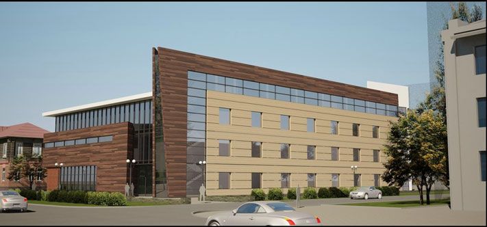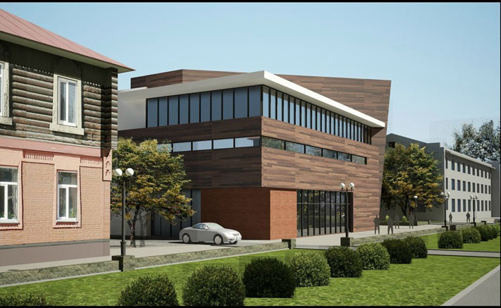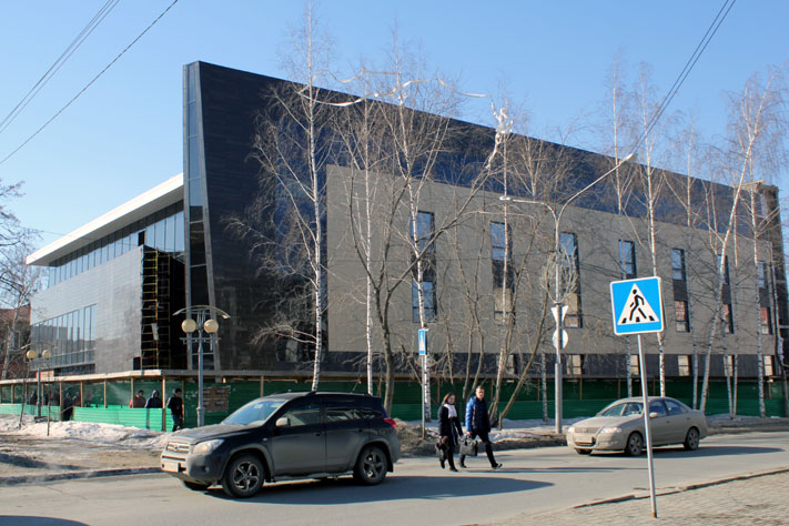 Новое трехэтажное здание, будущий торговый центр, получилось очень мрачным: