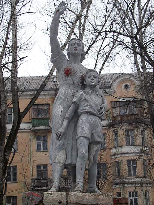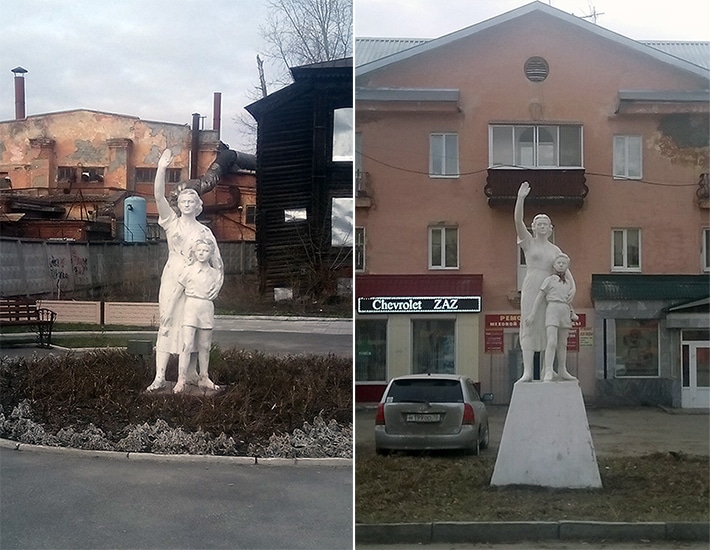 Точнее, две скульптуры. Забавно, но факт — две совершенное одинаковые женщины с одинаковыми мальчиками сегодня можно наблюдать в разных концах города. Первая приветствует нас пр. Комсомольском (перед домом № 63а, напротив корпусов завода «Манотомь»); вторая уже почти год как проживает на пл. Соляной, 6 — скульптуру (не новую, конечно) установили здесь ко Дню защиты детей.