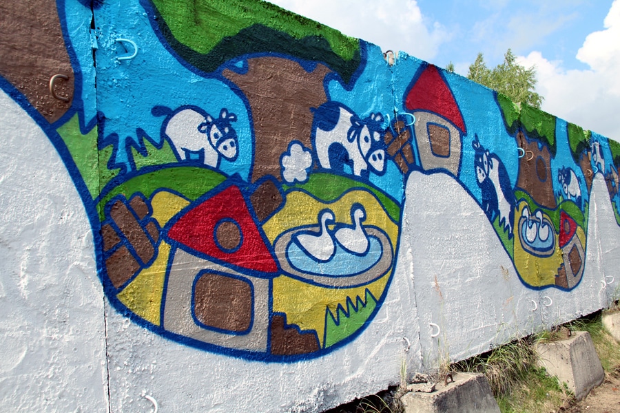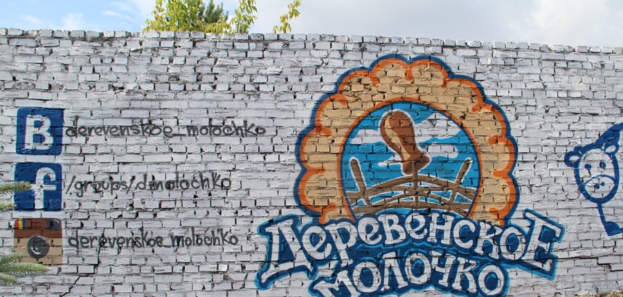 Но одними коровами дело благоустройства территории не ограничилось — забор завода отныне украшает красочное граффити в фирменном стиле общей площадью 100 квадратных метров. Над граффити три недели трудились профессиональные художники, в ход пошло около 20 литров краски.