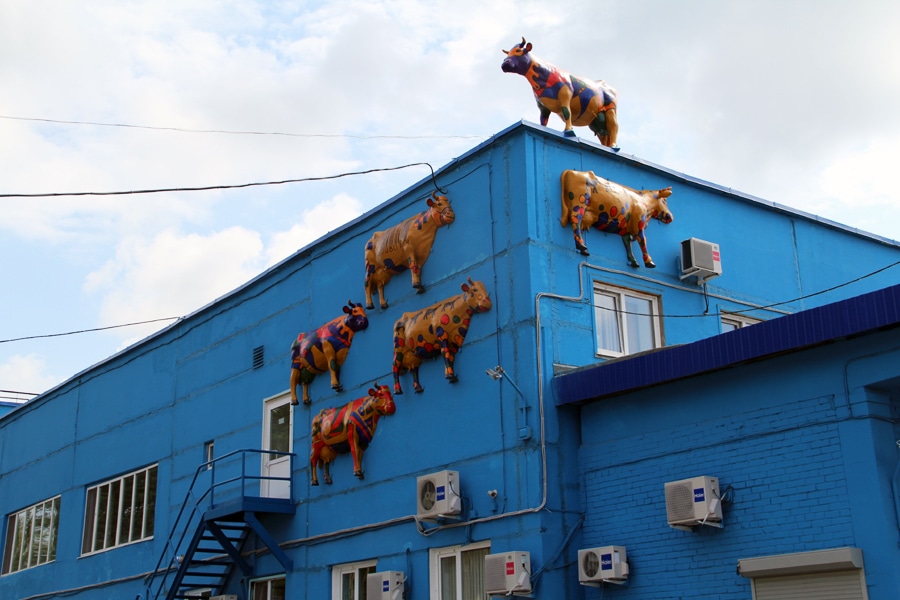 Совсем недавно на фасаде и крыше завода «Деревенское молочко» поселились шесть ярких коров. Скульптуры заказывали в Москве, изготовлены они из облегченного пластика и покрыты акриловой краской. При этом каждая «буренка» имеет свой неповторимый рисунок.