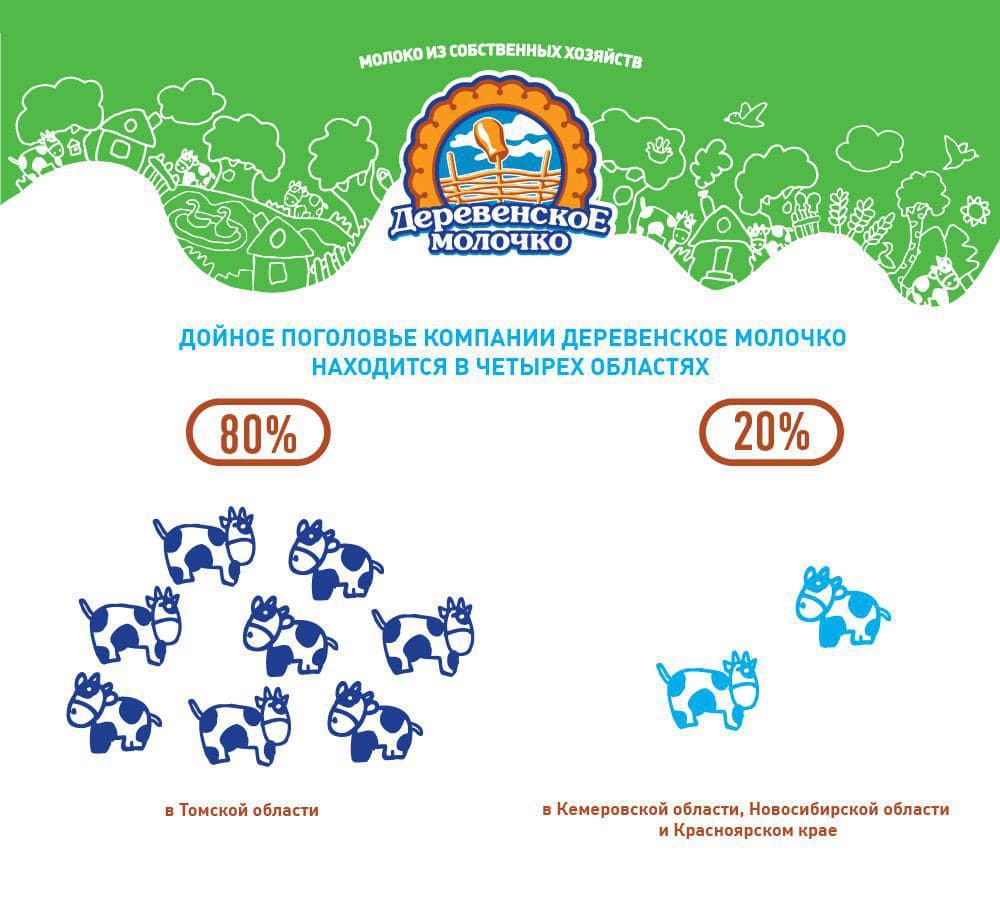 Дойное поголовье компании «Деревенское молочко» находится в четырех областях Сибирского федерального округа. При этом 80% приходятся на Томскую область, остальные 20% распределены по Кемеровской, Новосибирской областях и Красноярском крае.