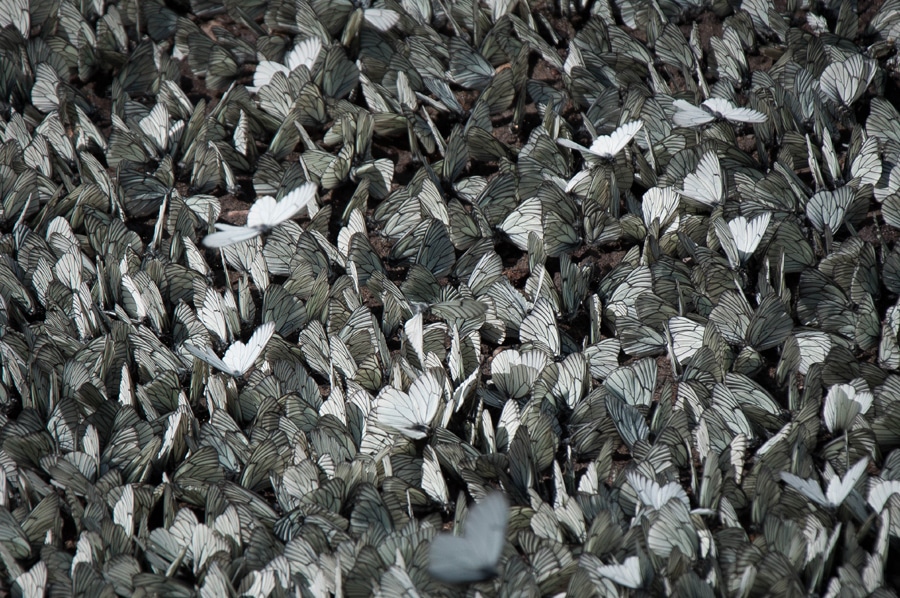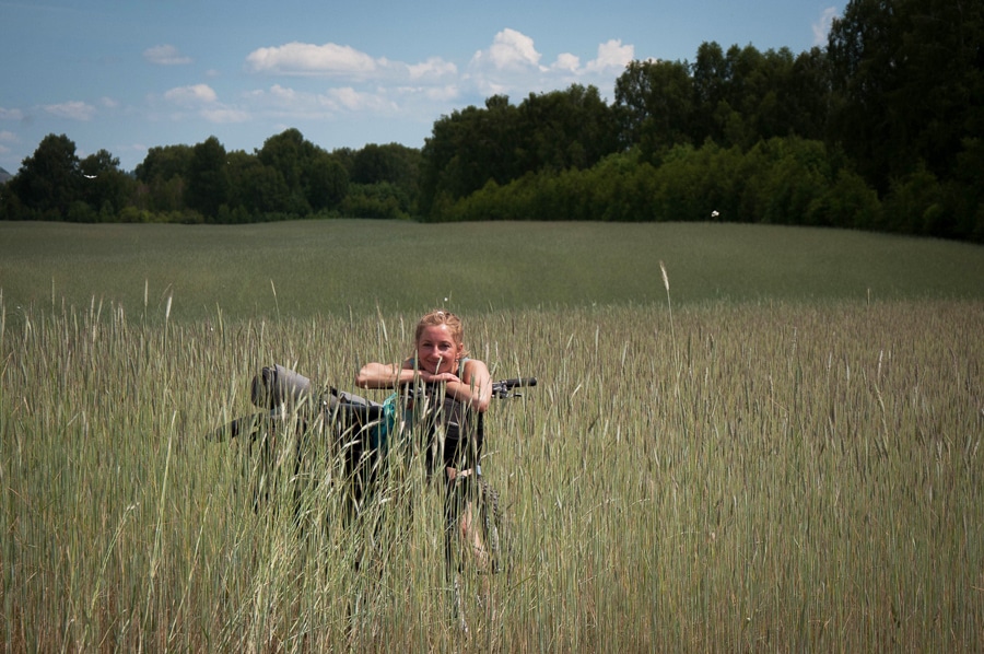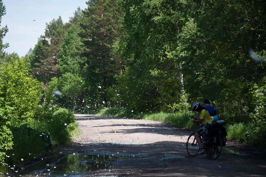 Главное отличие Алтая от Сибири — в отсутствии комаров, мошек, слепней и прочей кусачей живности. На природе ты можешь спокойно дышать и наслаждаться видами, а не судорожно махать руками и расчёсывать укусы по всему телу. Насекомое, которое сопровождало нас весь поход, и которому до нас не было никакого дела — это бабочки. Соня просветила нас, что обладательницы белых крыльев с чёрными прожилками — это не капустницы, а боярышницы. Примерно раз пять лет их настигает период массового размножения. Как раз эта пятилетка и пришлась на наш поход. Паря на велосипеде в облаках бабочек, я завидовала сама себе.