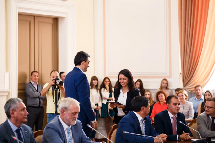 В завершение церемонии ректор вручил первые пять зачёток первокурсникам, поступившим в вуз без экзаменов по результатам высоких школьных достижений и побед в олимпиадах.