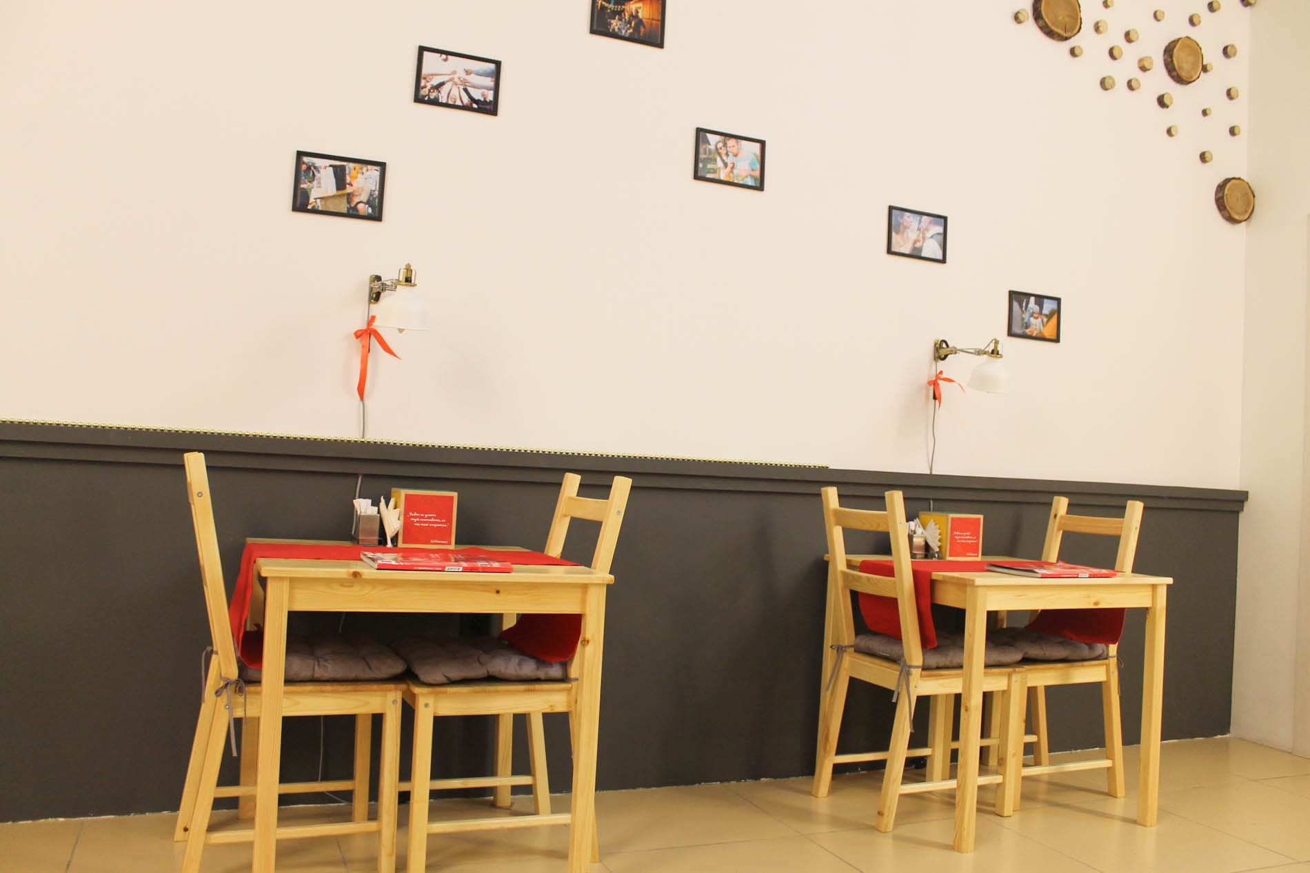 Интерьер: место словно создано для спасения от серого зимнего уныния. Теплые тона, натуральные материалы, комнатные растения на каждом столике и много света, различных ламп. Один зал со стеклянной стеной выходит на Фрунзе, в нем же находится барная стойка.
