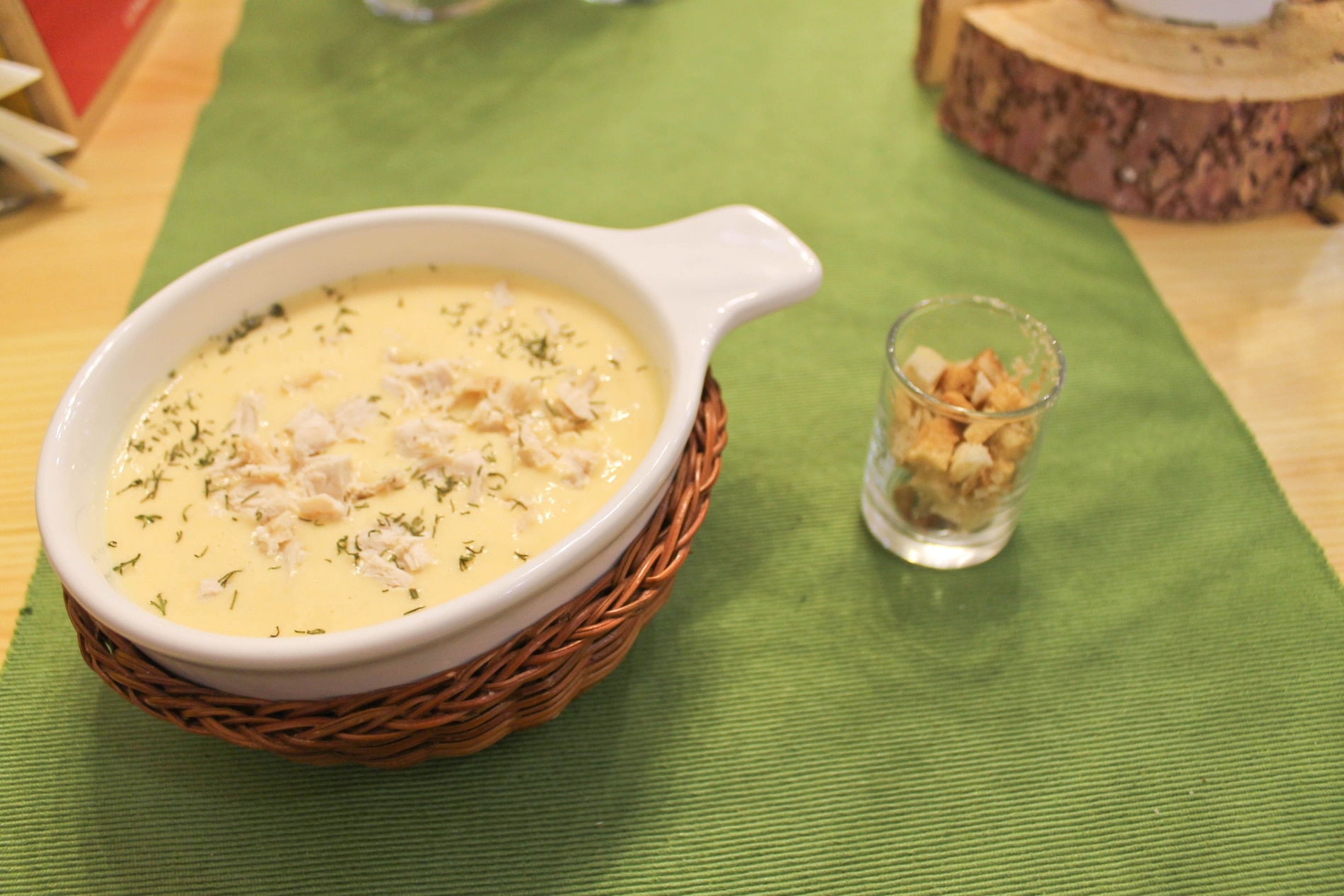 Сырный суп-пюре (130 рублей) хотелось сделать чуть горячее и немного острее. В целом понравился: курицы достаточно, она не суховатая, крутоны хрустящие, не пережаренные. Суп нежный.
