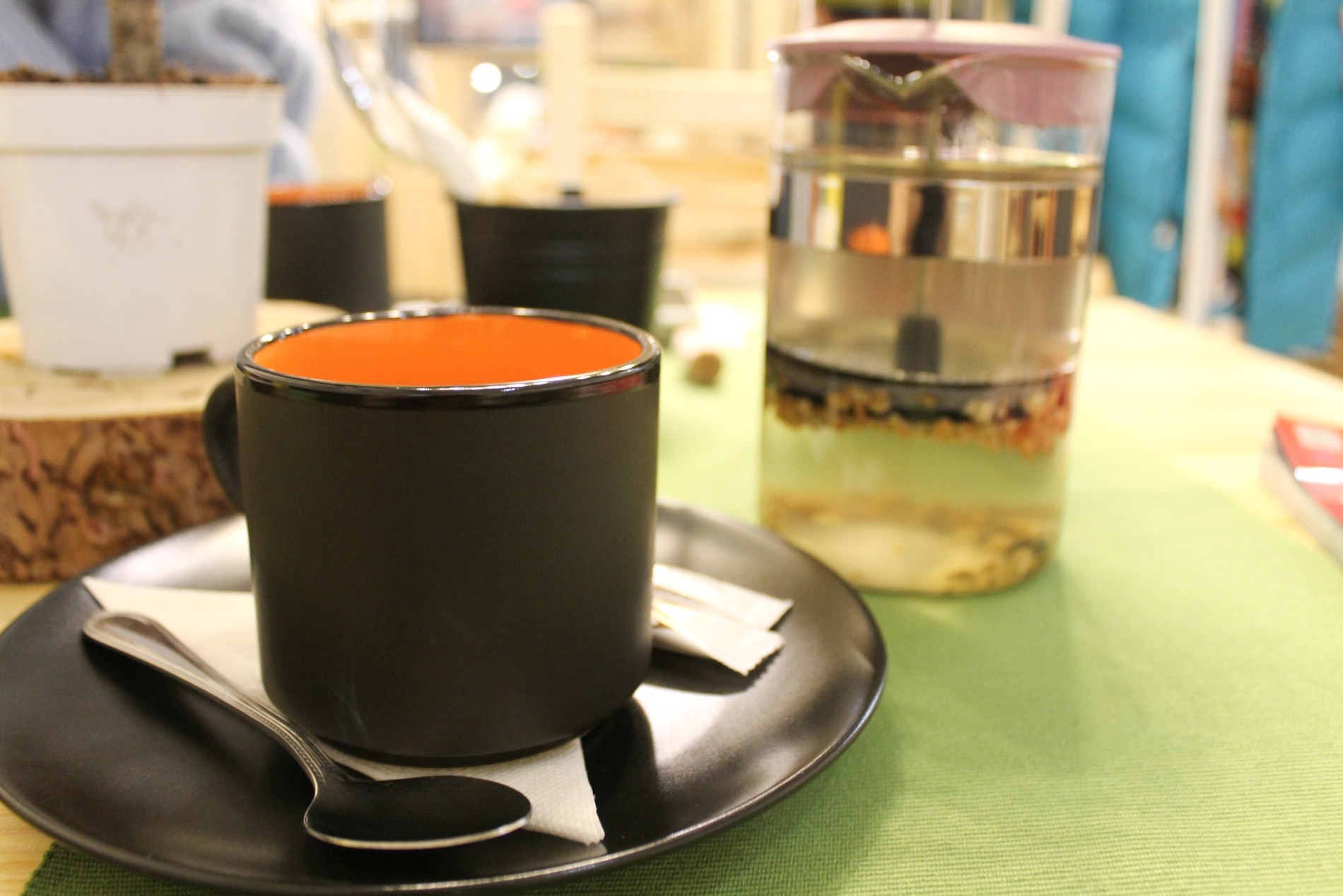 Еда: заказ делается у барной стойки и сразу оплачивается. После мучительных раздумий (много в меню аппетитных вариантов) мы выбрали сырный суп с курицей и крутонами, феттучини с морепродуктами и «интересный чай», вариант «медовое яблоко с имбирем».