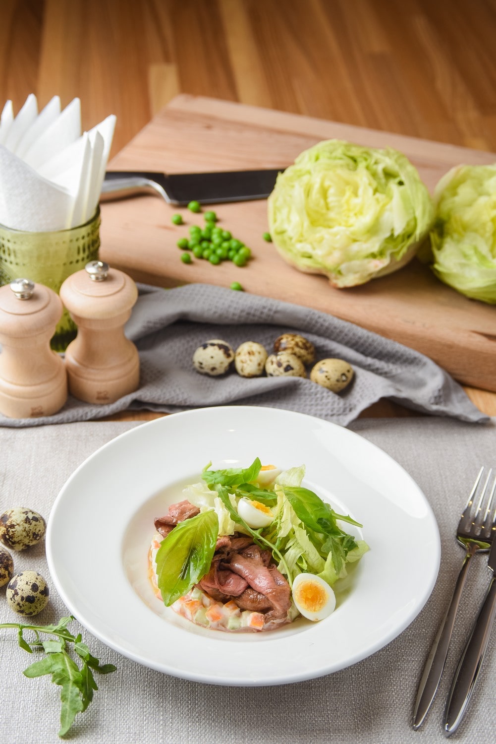 Но самый интересный вариант из тех, что нам удалось найти — это оливье в «Torta», недавно открывшей еще одно кафе на проспекте Фрунзе. Новогодний салат там делают с домашним майонезом на основе перепелиных яиц и ростбифом, приготовленным методом sous vide. То есть, в вакууме, когда продукт в упаковке без воздуха помещают в печь или ёмкость с термостатом и готовят при постоянной, точной и низкой температуре. Это позволяет добиться особой нежности продукта и его идеального маринования.