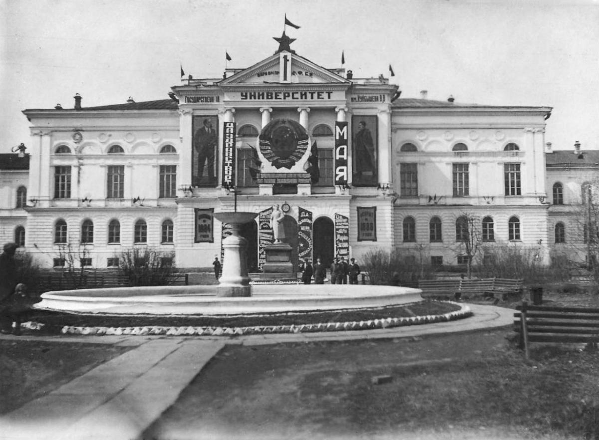 Главный корпус ТГУ во время первомайских праздников 1939 года. Перед входом - памятник И.В.Сталину. Фото из семейного альбома Марии Трухиной