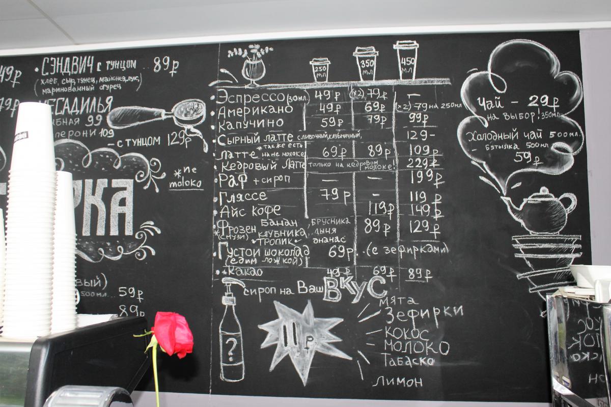 Что касается напитков, то чай в кофейне обойдется в 29 рублей, бутылка холодного чая – в 59. Молочный коктейль (он же смузи) от 89 рублей, морс 59 рублей. Кофе можно брать в разных объемах. Цены начинаются от 49 рублей. Представлена классика, из интересного – сырные варианты и латте с кедровым молочком. Очень актуальный во время нашей короткой, но «африканской», жары кофе со льдом тоже делают. В меню есть и горячий шоколад (сразу уточняется, что густой, его стоит есть ложкой, цена 69 рублей).