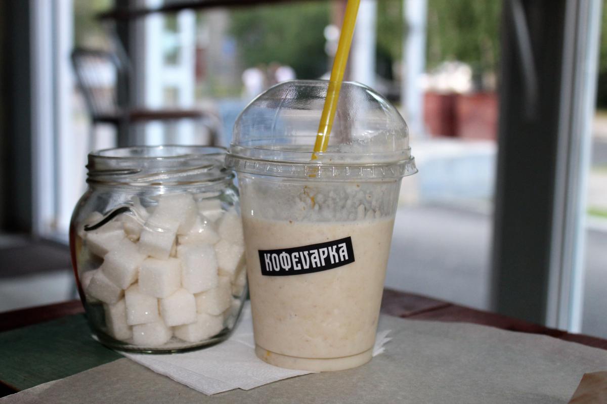 Мы решили попробовать бананово-ананасовый смузи. Из кофе думали заказать сырный латте, но после уточняющих вопросов девушка показала нам плавленый сырок «Омичка» с клубникой и сказала, что с ним кофе и взобьют. Не являясь поклонниками плавленых сырков, мы попросили сделать традиционный капучино маленького объема.