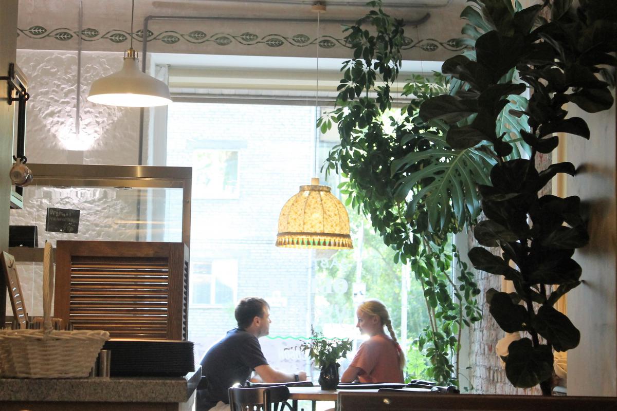 Интерьер: кафе значительно просторнее, чем прежний «Клаус» на Карташова. Два зала, есть столик на улице. Один зал со стойкой для заказов и столиками у больших окон. Второй спокойнее, там можно рассматривать интересные украшения на стенах, милые вещицы на комоде. В целом похоже на европейские кафе. На вывескe есть слово «Green». Зеленая тематика поддержана обилием растений.