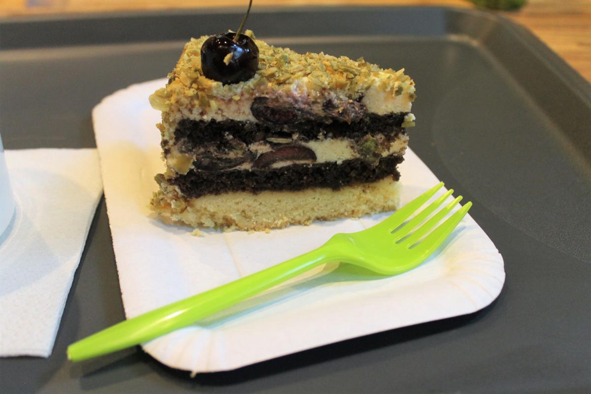 В творожном торте с черешней и тыквенными семечками (кусок за 131,10 рублей) бисквит сочетался с песочным тестом. Черешня была сочной, в заметном количестве. По сладости средний, не приторный, но за счет песочного теста и творожно-черешневой начинки очень легким торт не назовешь. Семечки малозаметны.