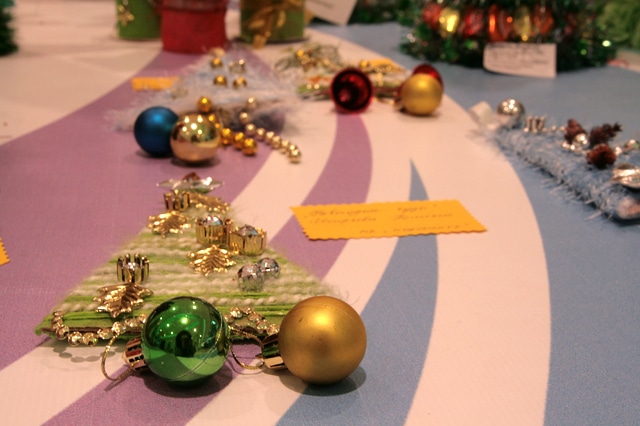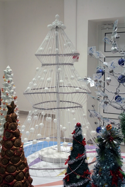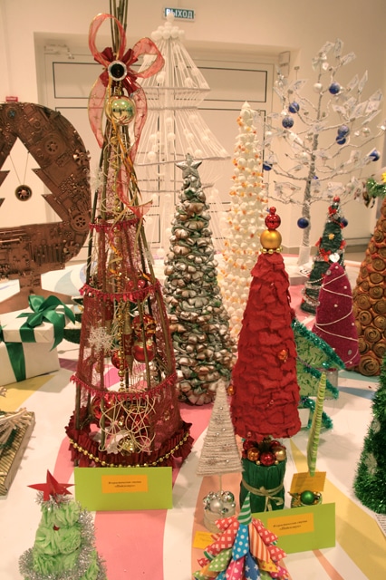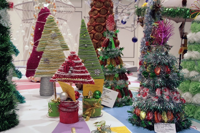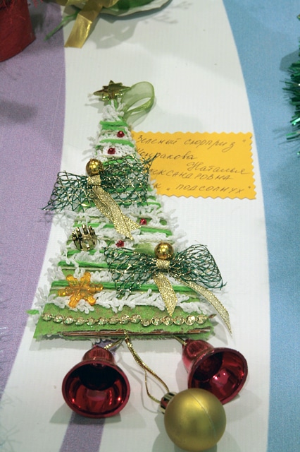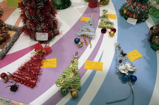Также елки ручной работы принесли сотрудники флористической студии "Подсолнух". Елочки сделаны из картонной основы, обмотаны нитками и украшены лентами, блестками и прочей бижутерией.
