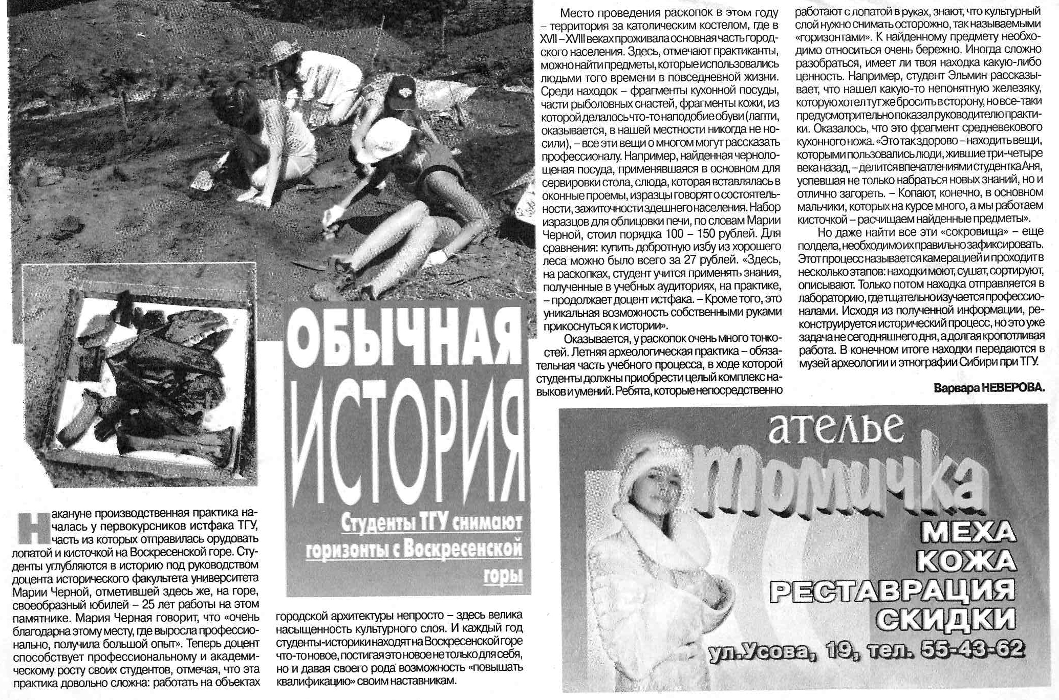— Русской археологии в Томске тогда не было вообще. Я была последней, кому предложили — но чуйка сработала, и я согласилась, хотя тоже специализировалась на аборигенной археологии, — рассказала Мария Чёрная. — У меня к тому времени уже был некоторый опыт — и работы писала, и в экспедициях была. В итоге, я еще не закончила университет, а меня уже приняли на работу.