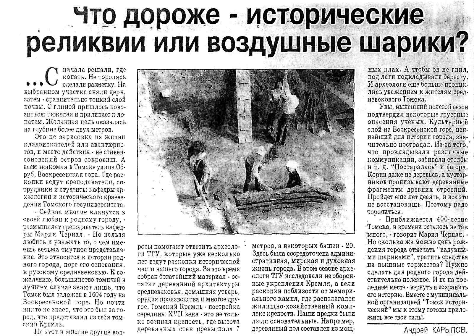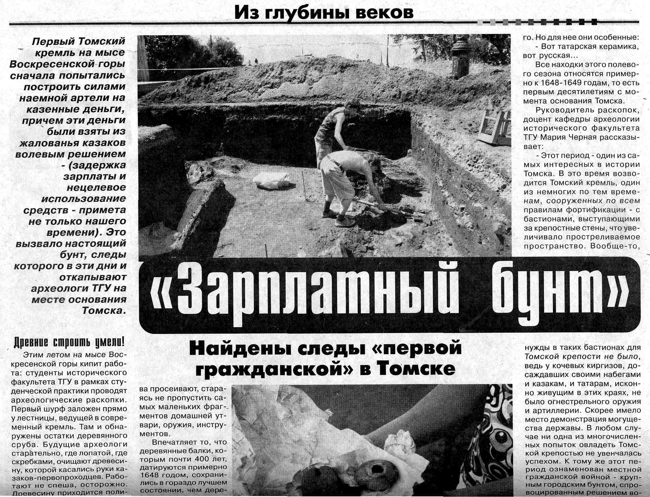 Это был не первый подход археологов к Воскресенской горе: в 1968 году, в преддверии очередного юбилея, город копал один из лидеров томской археологической научной школы Владимир Матющенко. На его работы и ориентировалась Чёрная в первый год своих изысканий. Раскопки проводились на территории кремля — административно-политического центра и укрепленного ядра города, обнесенного стеной. Заложили два раскопа. Один из них — на месте воеводской усадьбы, занимавшей значительную площадь в кремле, которую начал копать еще Владимир Иванович.