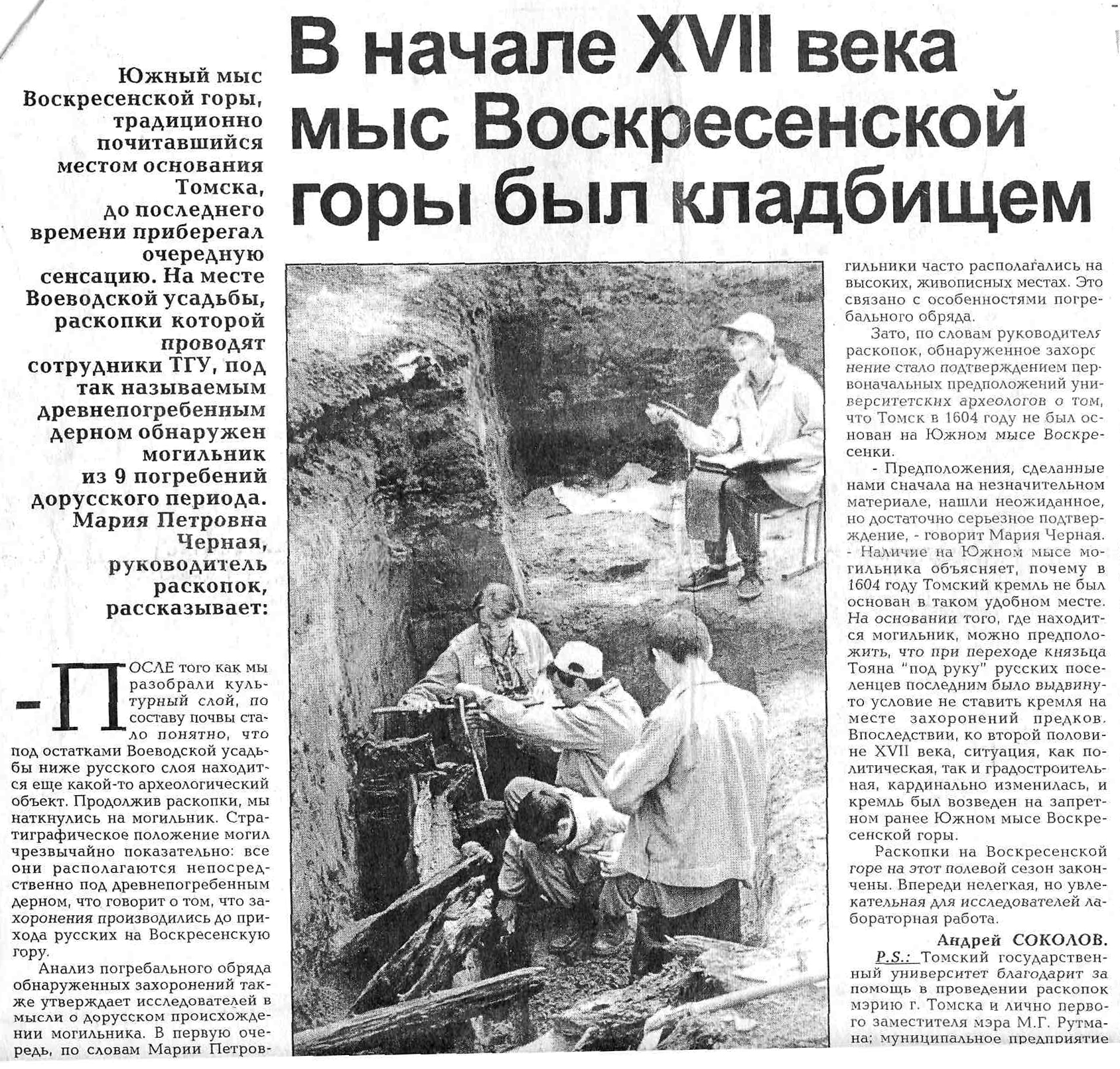 Мария Петровна Чёрная взялась за раскопки Томского кремля еще в 1983 году. Работы в центре города организовывал институт «Сибспецпроектреставрация», планировавший создать на территории Воскресенской горы музеефицированный комплекс «Старый Томск». В поисках рук сначала обратились к московским археологам, затем к местным — но все отказались, так как специализировались на «аборигенной археологии». Томские раскопки предполагали «русскую археологию» — а у нее своя специфика.