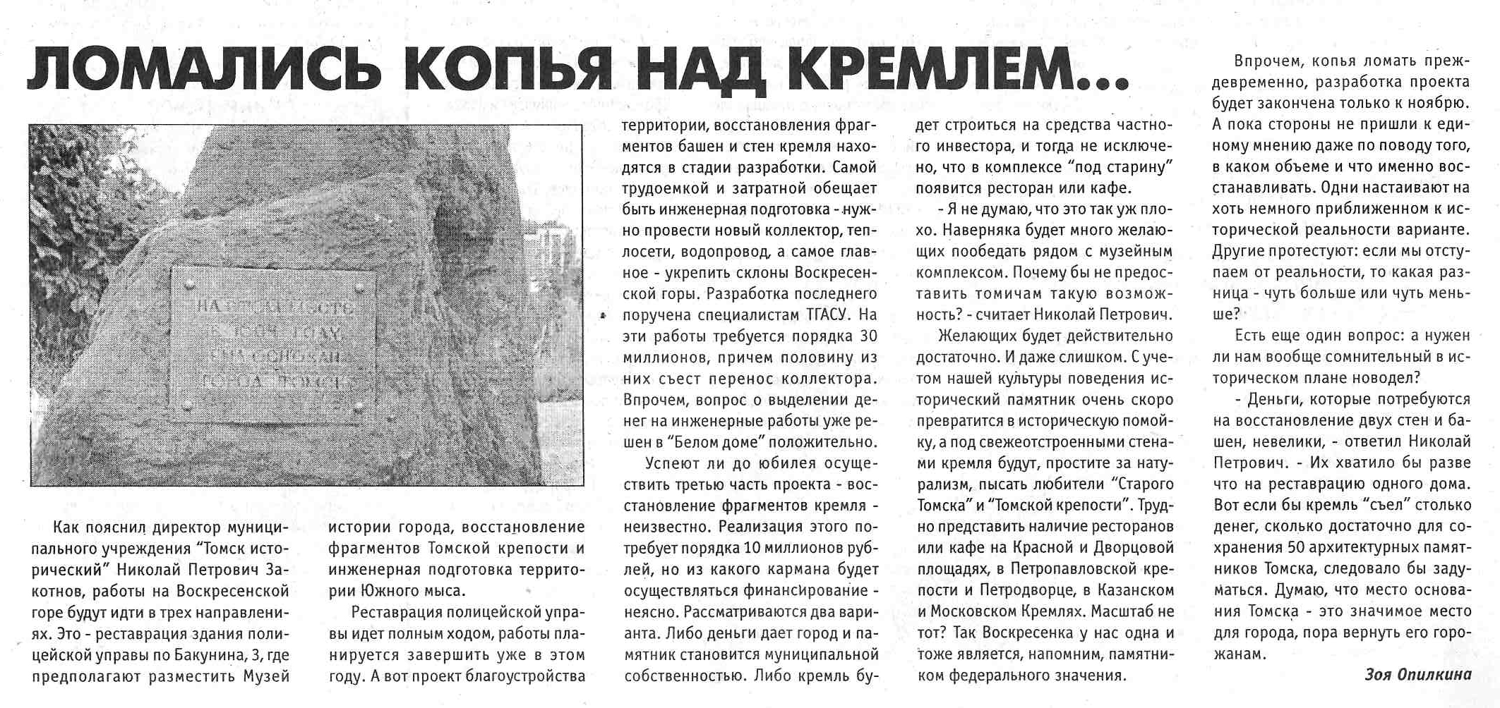 Она считает, что с исторической точки зрения Томский кремль — тот градообразующий объект, который должен быть хотя бы частично восстановлен. Сейчас планы о реконструкции фрагмента тарасной стены и воеводской усадьбы обсуждаются с Музеем истории Томска, возможно, проект удастся реализовать к 425-летию города.