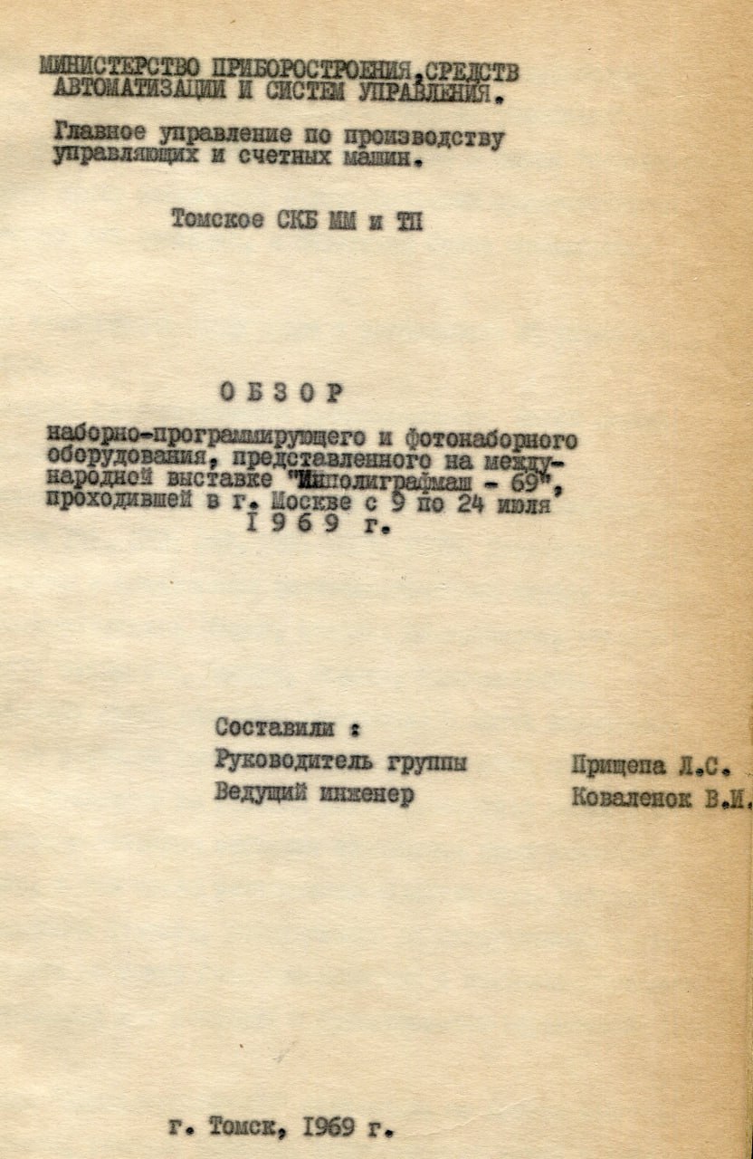 1961 г. В СКБ сформировался творческий коллектив разработчиков, который занялся освоением средств автоматизации производственных процессов, в том числе и для типографий. В то время создание первых устройств для полиграфических предприятий проводилось на конкурсной основе. Результаты испытания показали, что томское устройство было лучшим.