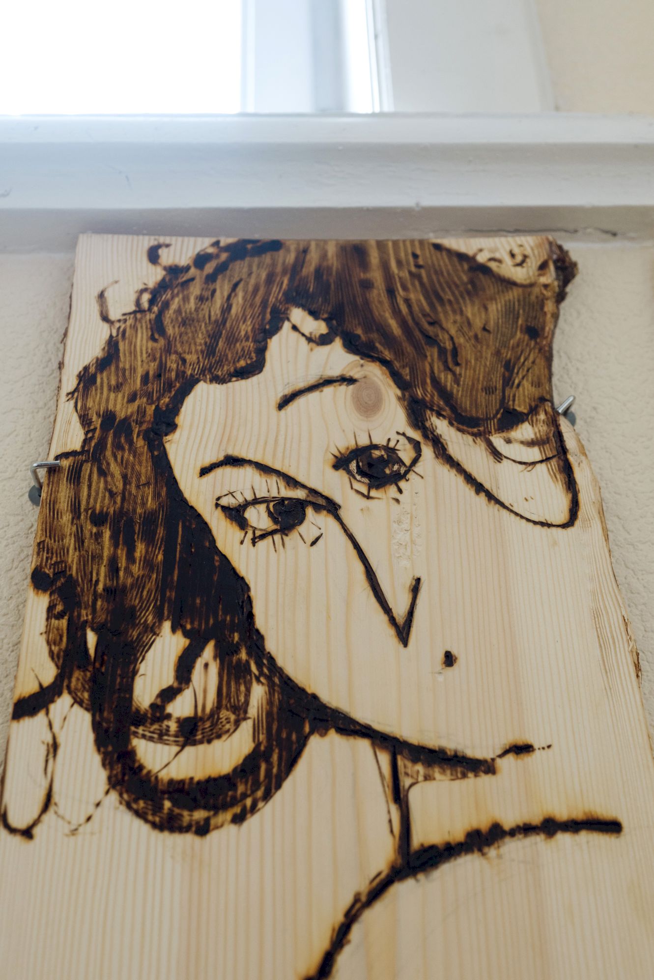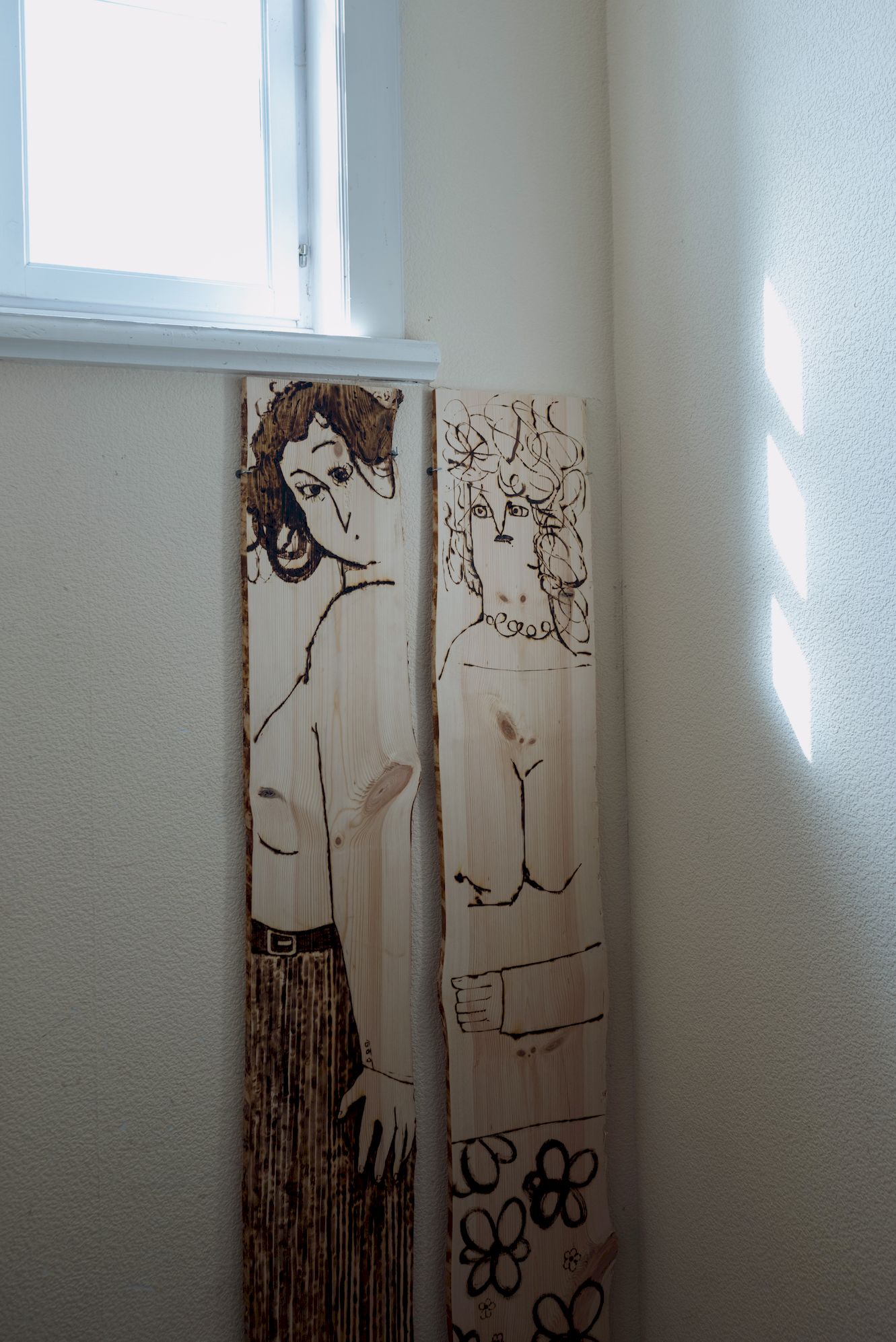 «Эта комната заполнена столами и чертежными досками. Доски везде, даже в туалете. Я рисую на них гигантских, уродливых, угловатых и кудрявых теток. Странно, но меня не ругают», — так пишет внучка А.Д. Крячкова, Амата. Эта работа — реконструкция прошлого, воплощённое наяву воспоминание из детства.