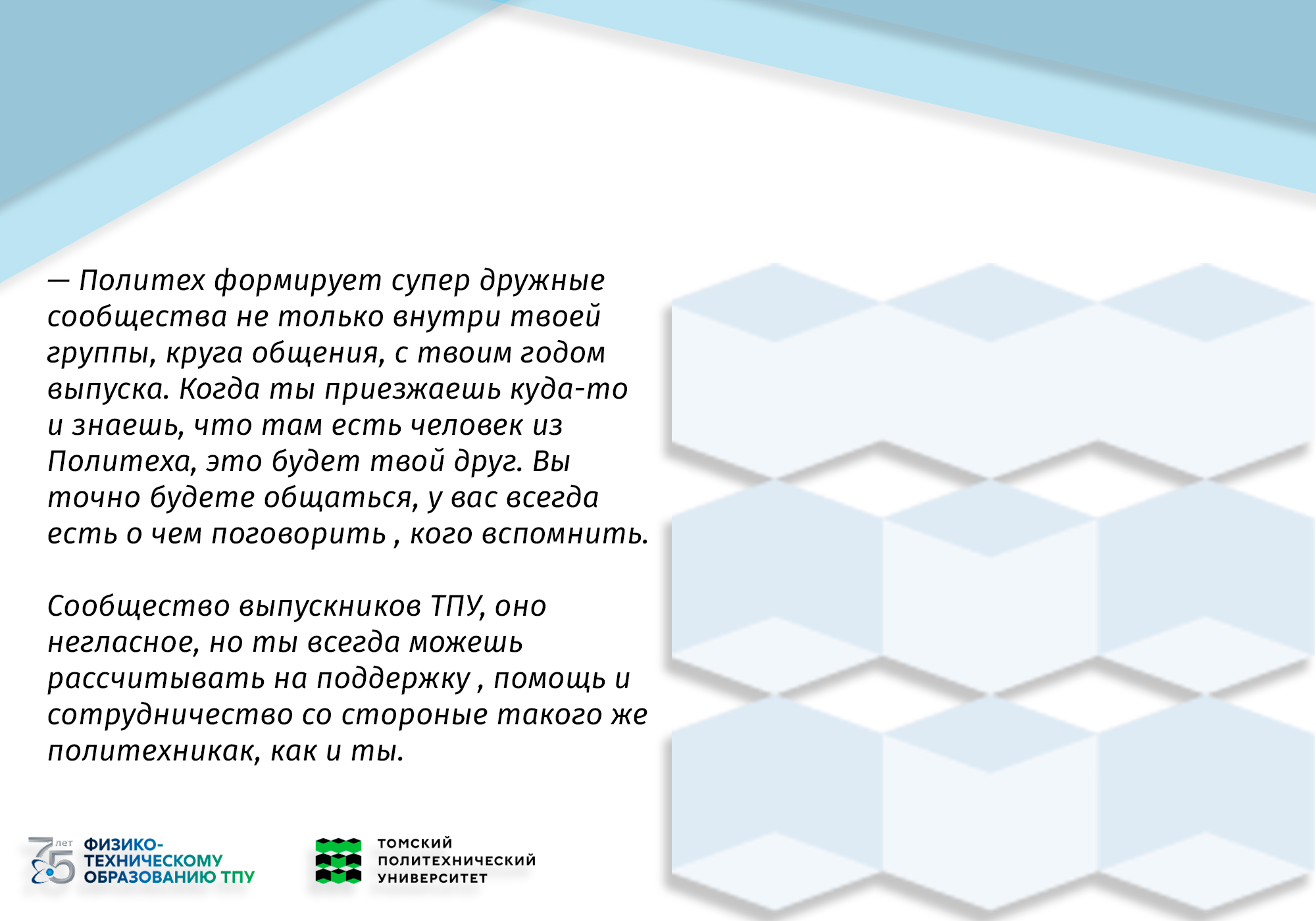 — Чаще встречаю, конечно, специалистов старше себя. Это первоклассные инженеры, потрясающие руководители, — рассказывает Алина. — Но недавно стали приезжать ребята младше нас, и тоже отличные спецы. Политеховца видно просто издалека: это всегда наиболее собранные, самые умные, быстрее всех схватывают, самые инициативные! Выпускников ТПУ очень любят у нас в отрасли, это мы и на себе заметили — нас всегда хвалили. Политех готовит реально суперклассные кадры, планку не снижает.