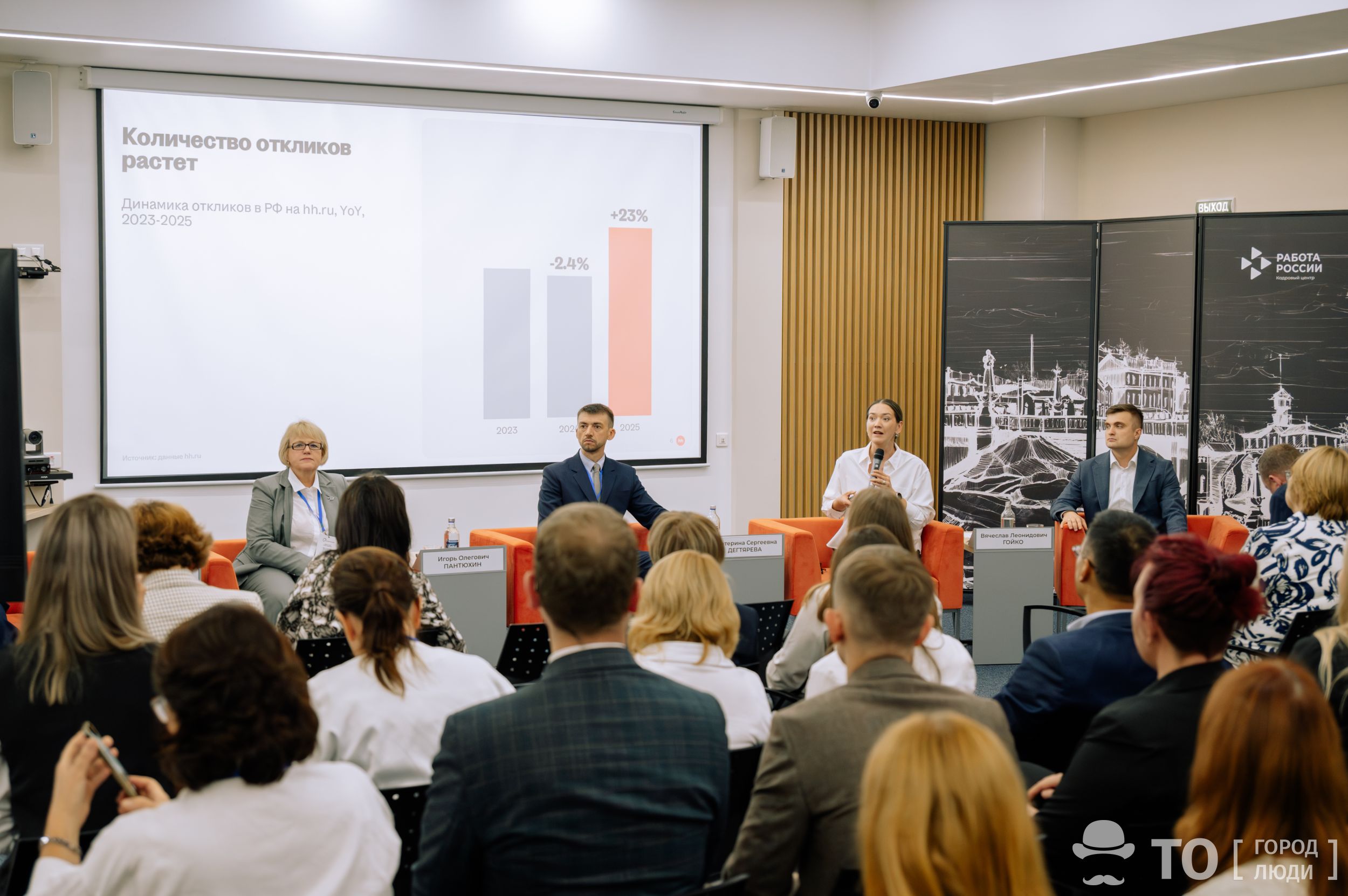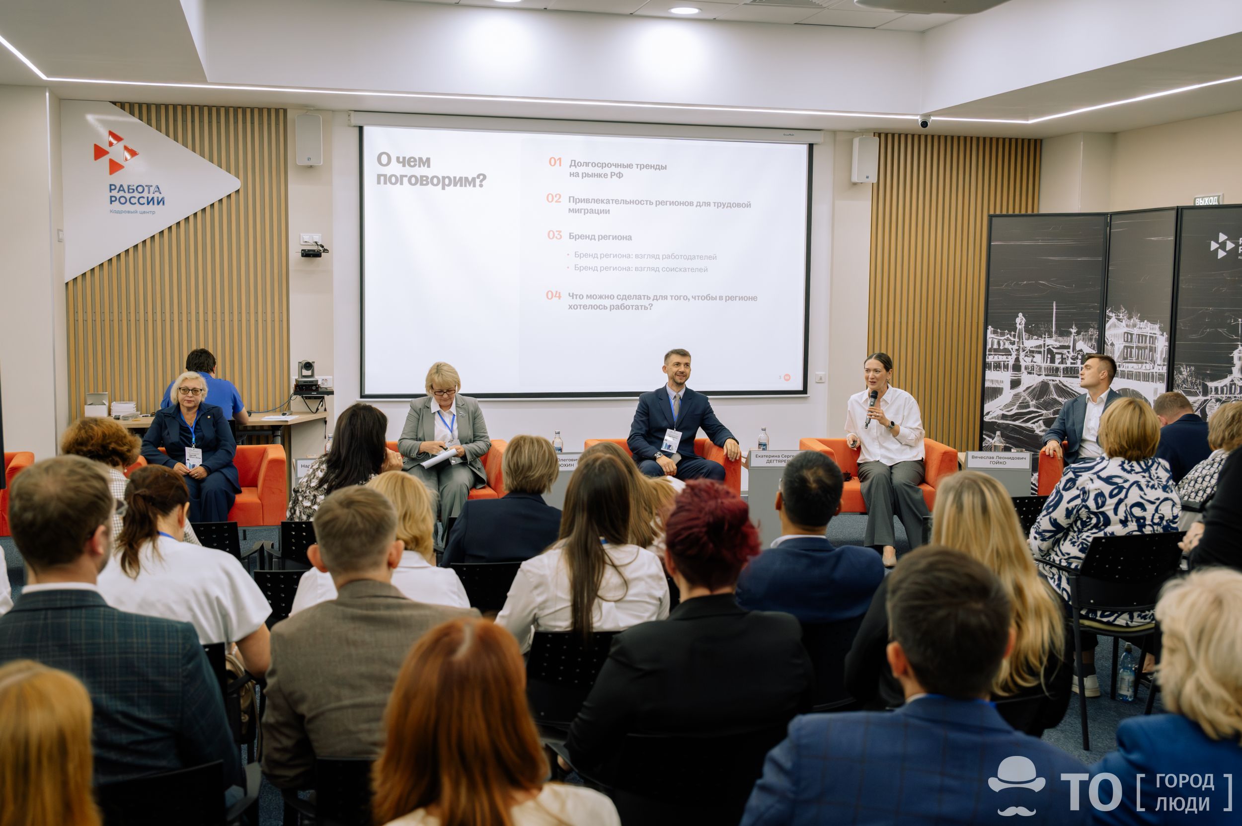 Форум продолжился панельной дискуссией в томском кадровом центре «Работа России». Её участники обсудили успешные региональные практики прогнозирования кадров, формирование HR-брендов территорий и кадровое обеспечение регионов.