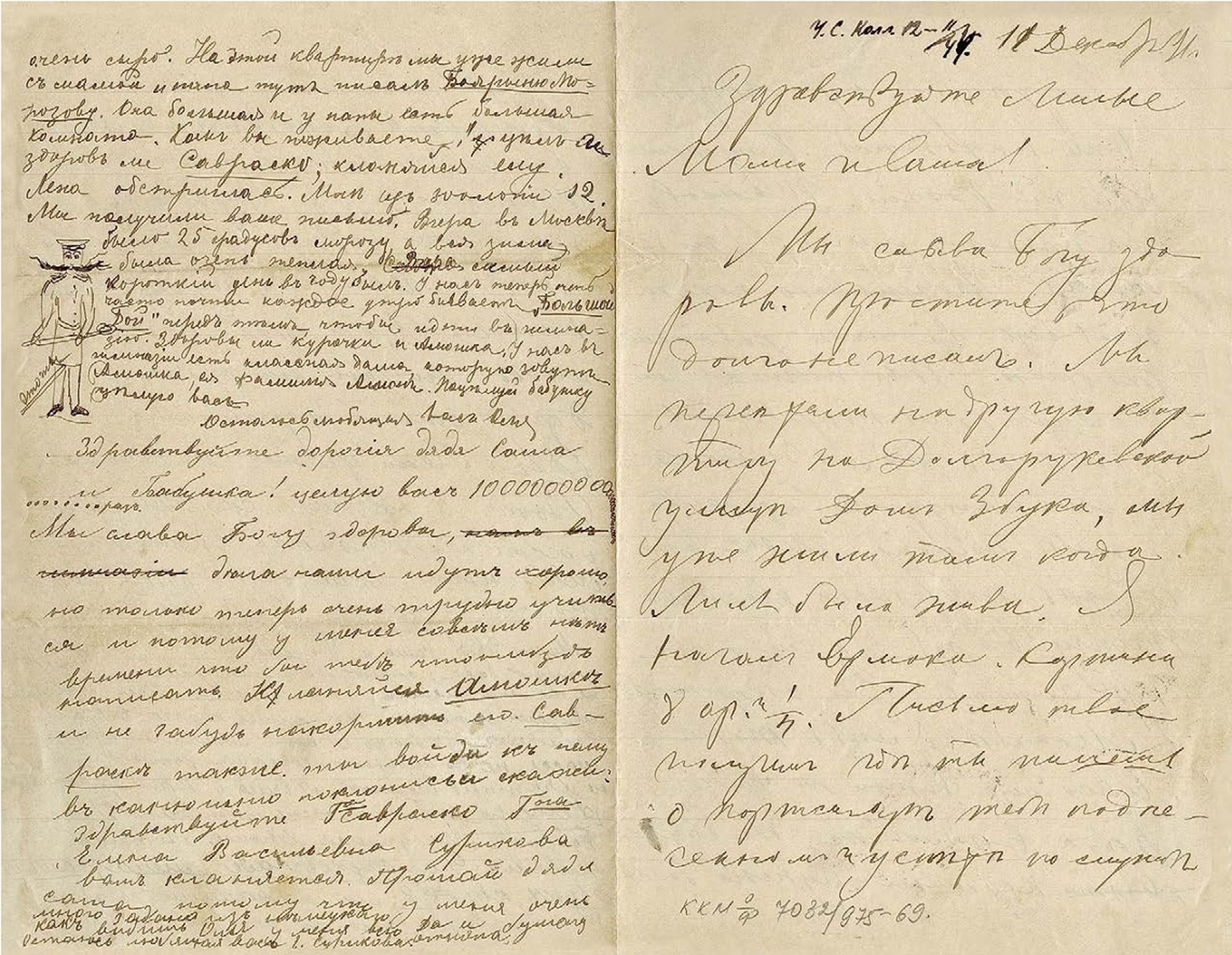 — Об их существовании, собственно говоря, даже не было известно, потому что, видимо, из Красноярска прислали в Москву набранные машинописные копии именно текстов Сурикова. А эти приписки Оли и Лены, конечно, очень интересны нам именно сейчас, когда история повседневности сильно развивается. Мы можем увидеть, что писали, как писали восьми-девятилетние девочки из интеллигентной семьи, дочери художника, на рубеже XIX–XX веков. Также в письмах прослеживаются детские взаимоотношения. Например, идет текст письма, написанный чернилами, но неожиданно чернила сменяются на карандаш. Причину этого мы узнаем в письме. Лена пишет, что «Оля отобрала у меня перо с боем, и я пишу карандашом». «Боем» они называли потасовки между собой, которые были довольно частыми. Или в одном из писем Оля рассказывала, как Лена надела себе на голову банку с вареньем и всю ее вылизала. Это, конечно, представить сложно, но все это рассказывает о жизни девочек того времени.