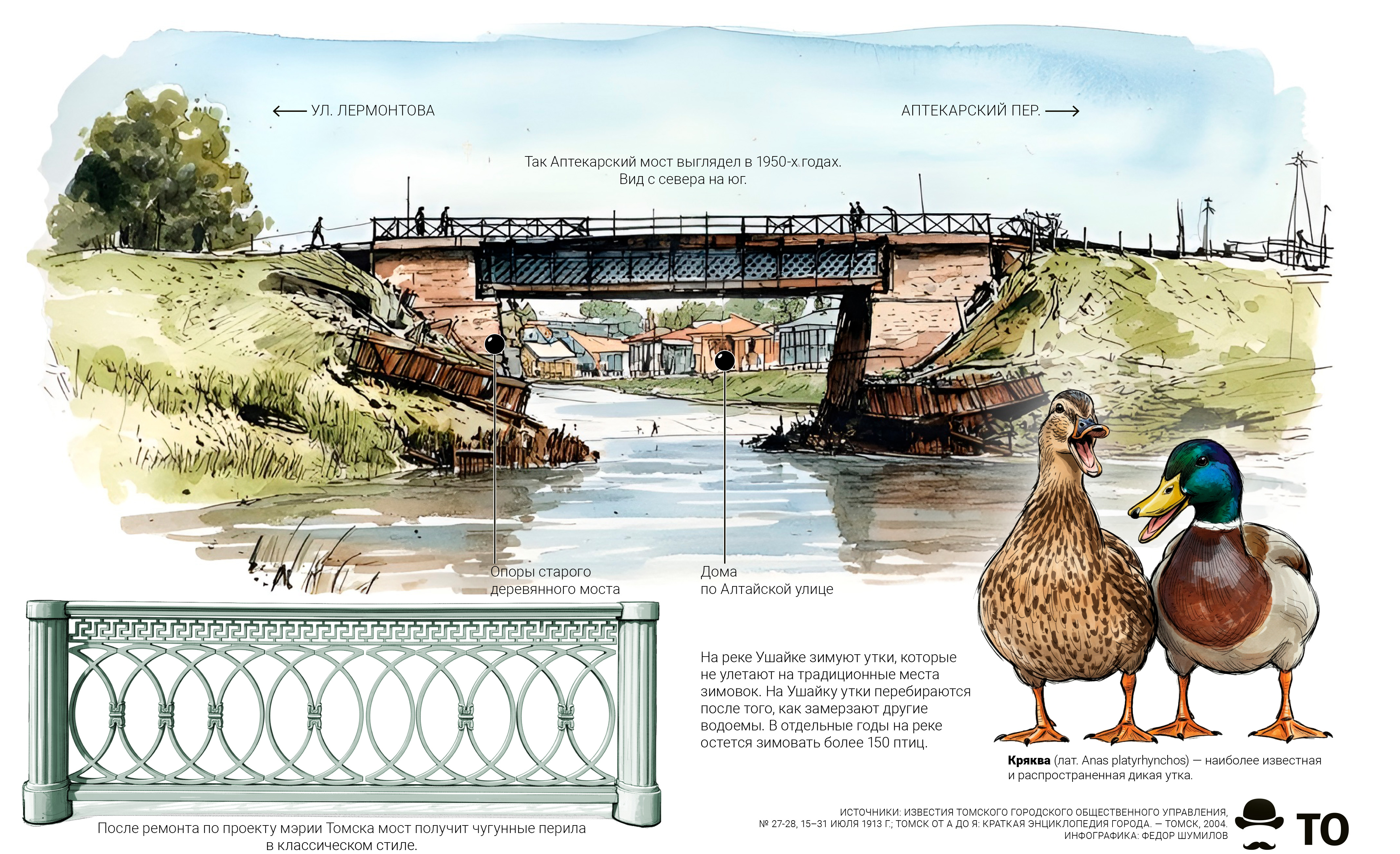 Аптекарский мост — одно из исторических инженерных сооружений в центре города. Небольшой, но нужный: более ста лет он соединяет Болото с Уржаткой. В новой серии нашего совместного с мэрией проекта «Анатомия Томска» рассказываем историю моста.