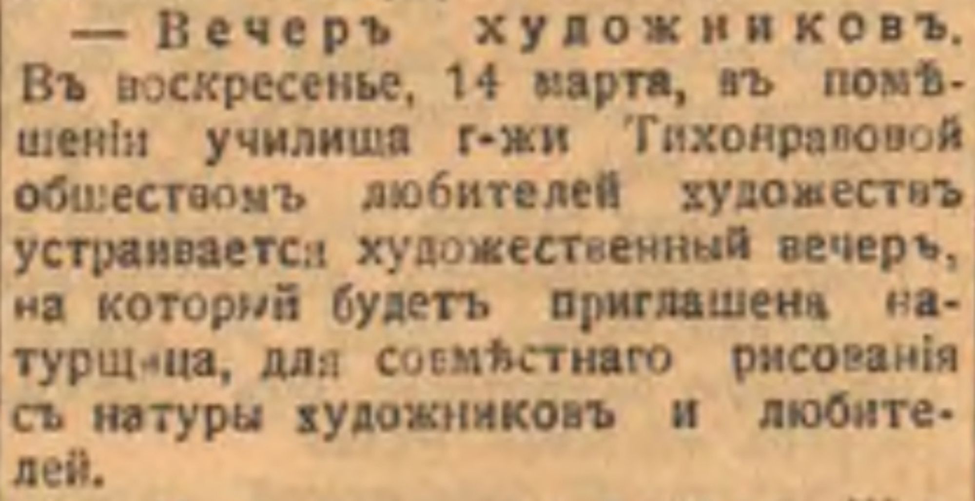 Встречи сопровождались не только групповым рисованием с натуры, но и включали лекции, чтение поэзии, а иногда и пение. Объявления о таких вечеринках можно было встретить в газете «Сибирская жизнь». Публиковались не только сами анонсы художественных вечеров, но и отчеты о том, как они проходили. Отмечалось, что главный интерес вечера — совместное рисование художников и любителей.