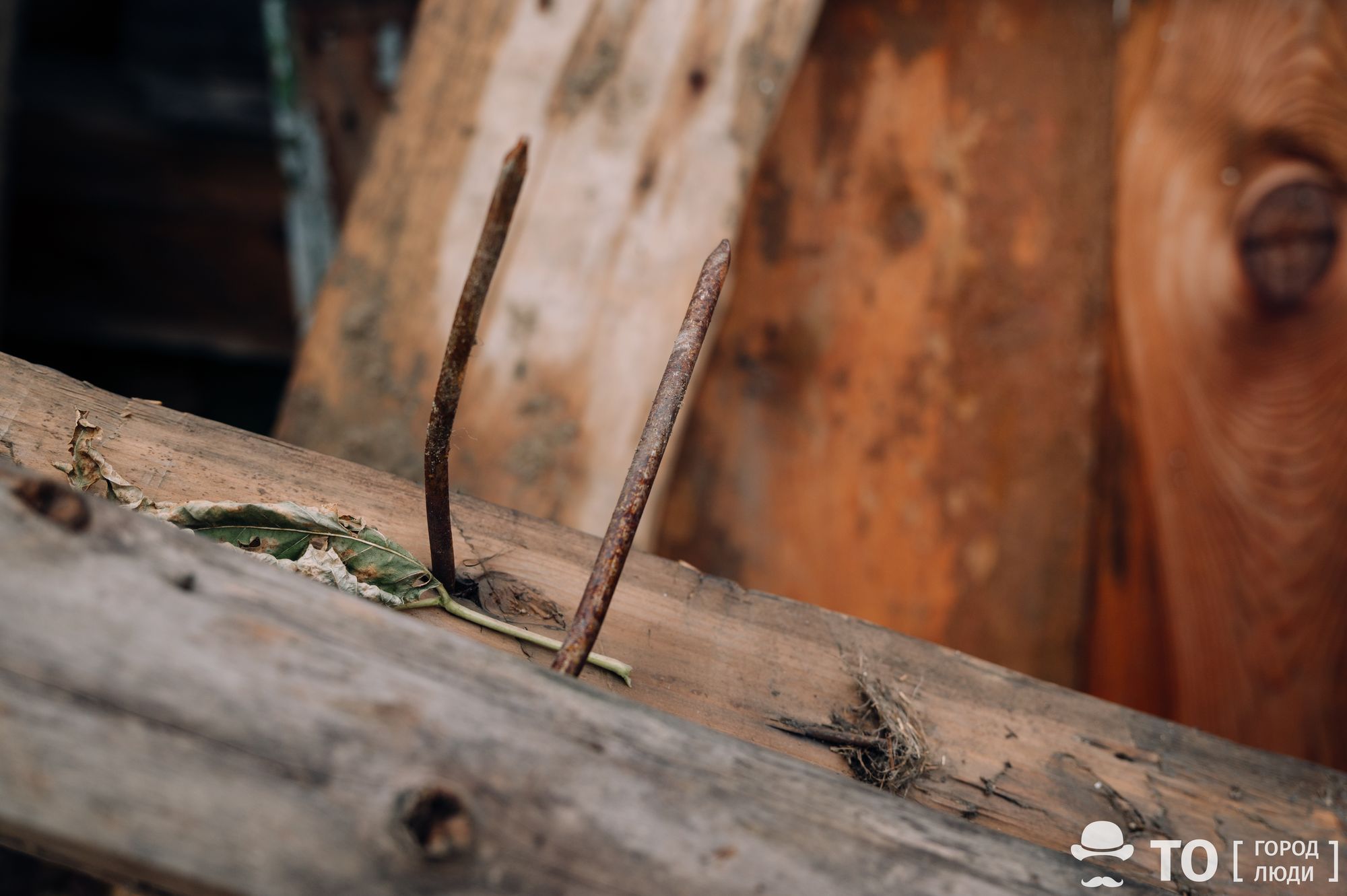 Например, целое ведро старинных кованых гвоздей. Доски для межэтажного настила — они, кстати, отличаются между собой: для чердачного перекрытия использовались более толстые плахи, чем между первым и вторым этажом. И направляющая для обшивки дома (на фото).