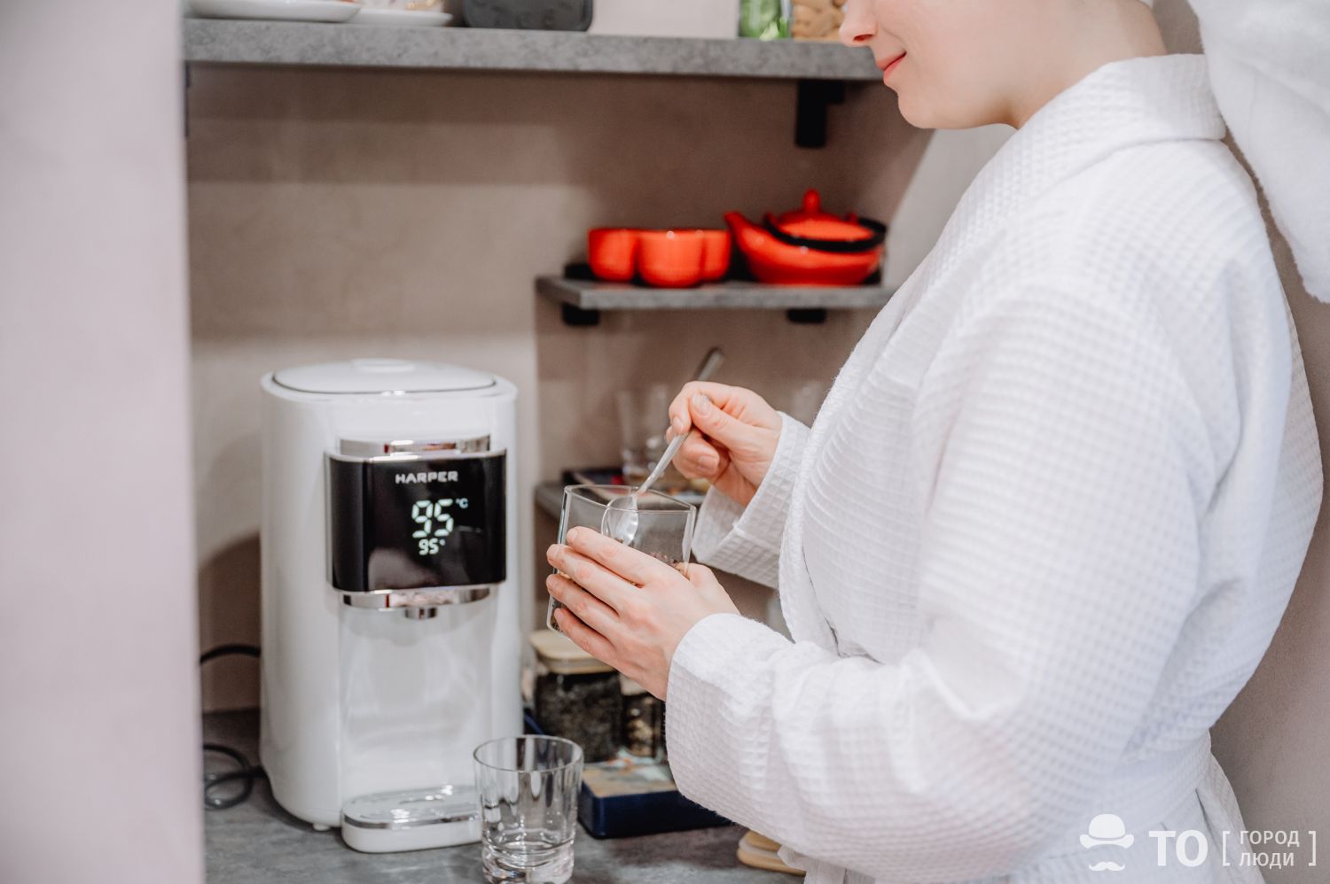 Чалма из полотенца готова — отправляемся пить чай и валяться с книжкой. Заслужили, так считаем! В зоне отдыха стоит термопот, установленный на 95 градусов — ниже температуры кипения специально под сорта чаев, представленных здесь же. Почему делаем акцент? Потому что знаем: не все любят кипяток. Тут потребности разбавить воду из термопота нет.