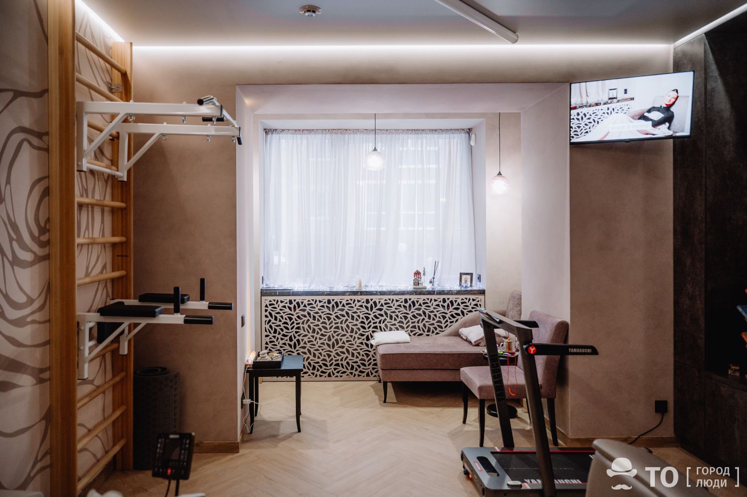 После этого нас провожают непосредственно в сам зал. «Стоп-стресс» — это небольшое уютное пространство, в котором уместилось вообще все, что может пригодиться для быстрых тренировок и качественного отдыха: удобная оттоманка, беговая дорожка, шведская стенка, турник, бьюти-ролл, коврик для йоги и другой спортивный инвентарь. Даже душевая комната!