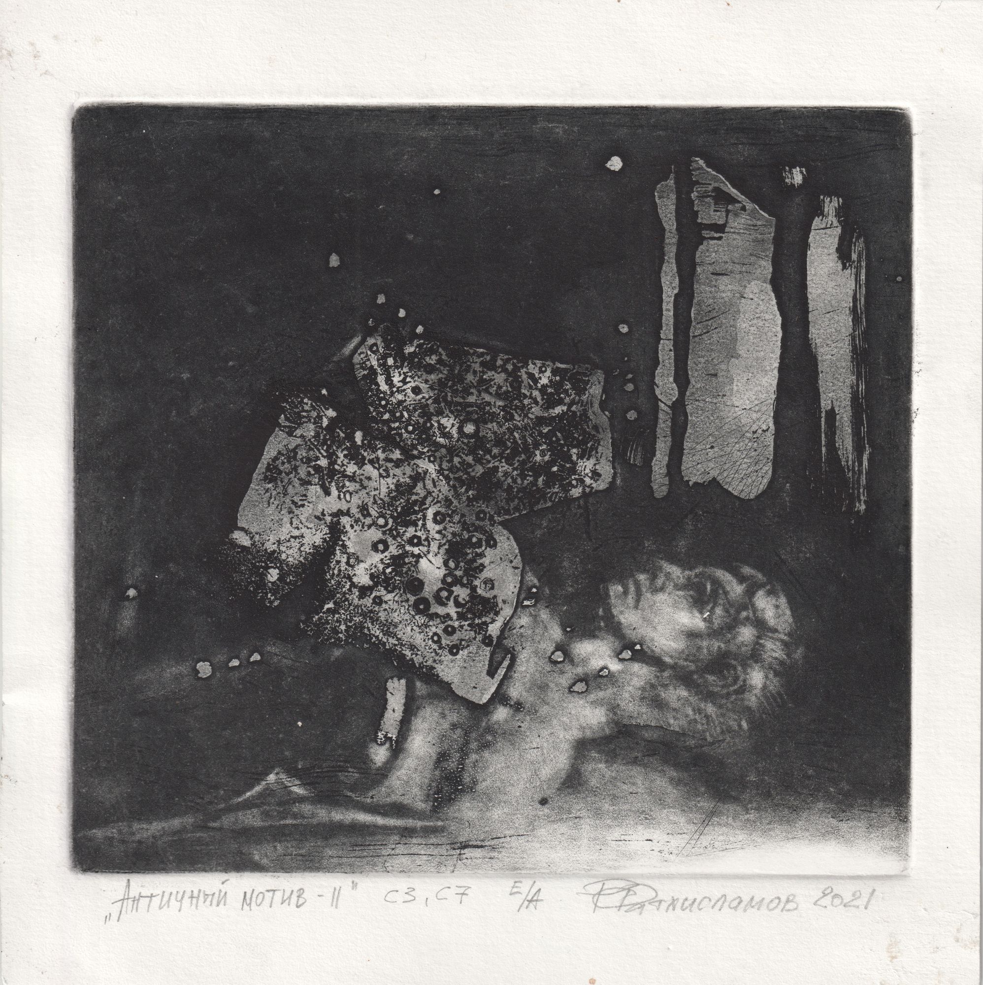 Художник и преподаватель, владеющий разнообразными графическими техниками — шелкографией, литографией, использует сложное сочетание офорта, меццо-тинто, акватинты и мягкого лака. В творческой деятельности Руслана Фатхисламова печатная графика занимает особое место, и на предстоящей выставке можно будет познакомиться с произведениями из серии «Античный мотив», выполненных в техниках глубокой печати — офорт и меццо-тинто.