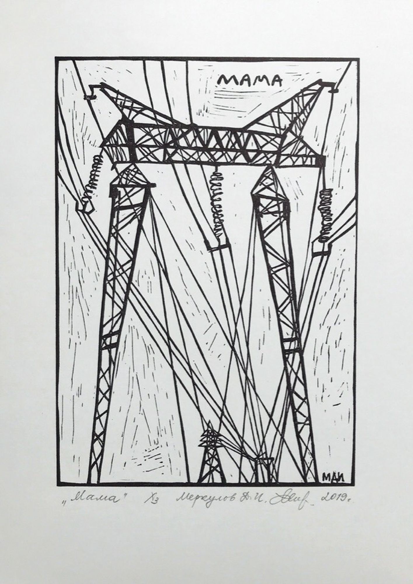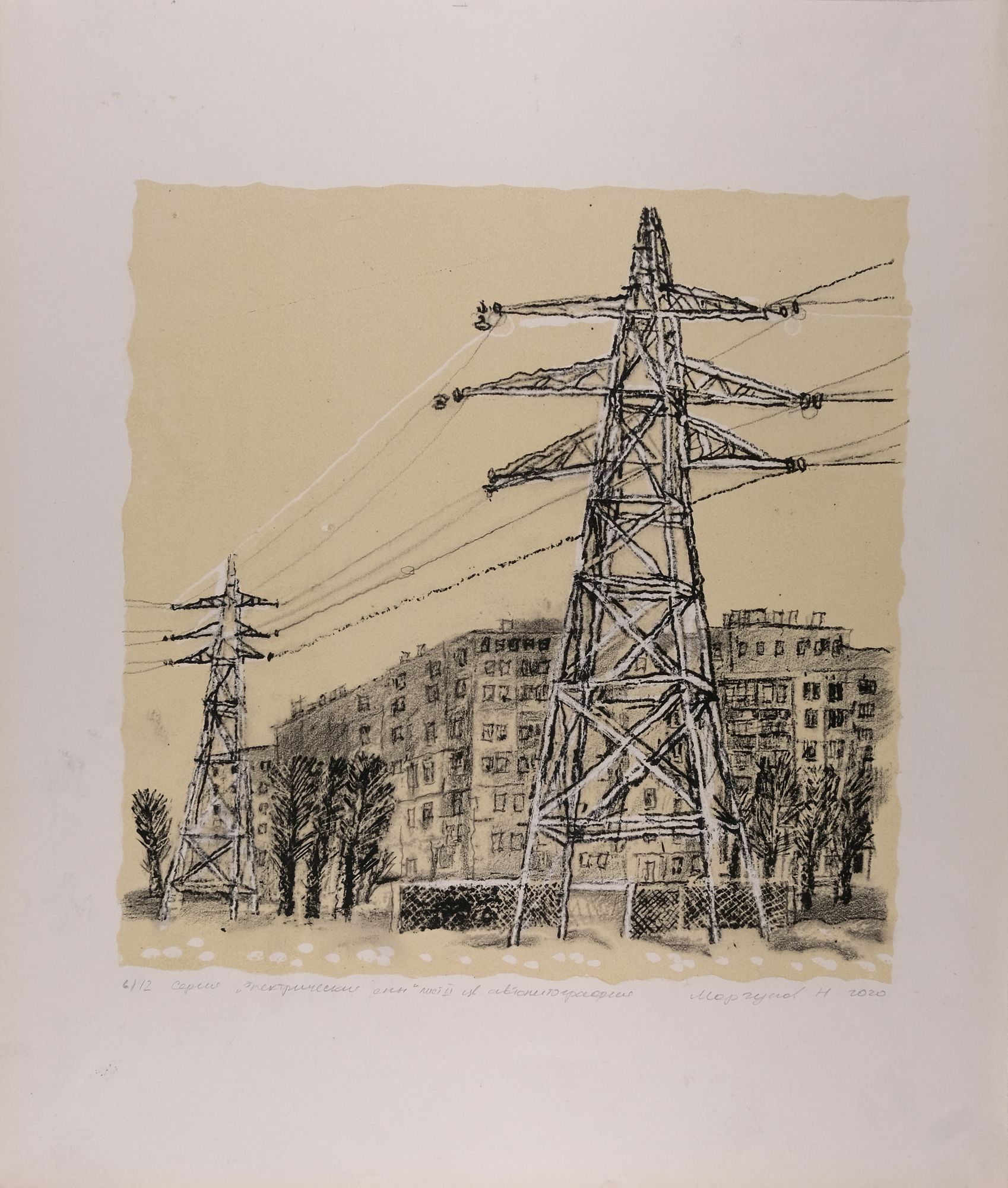 «Посвящена мотивам городских окраин Екатеринбурга. На литографиях изображены конструкции линий электропередач на фоне спальных районов — знакомые с детства силуэты и звуки, сопровождавшие прогулки и навсегда оставшиеся в памяти. Эти образы объединяют реальность и воображение, превращая привычный городской пейзаж в пространство созерцания и сна».