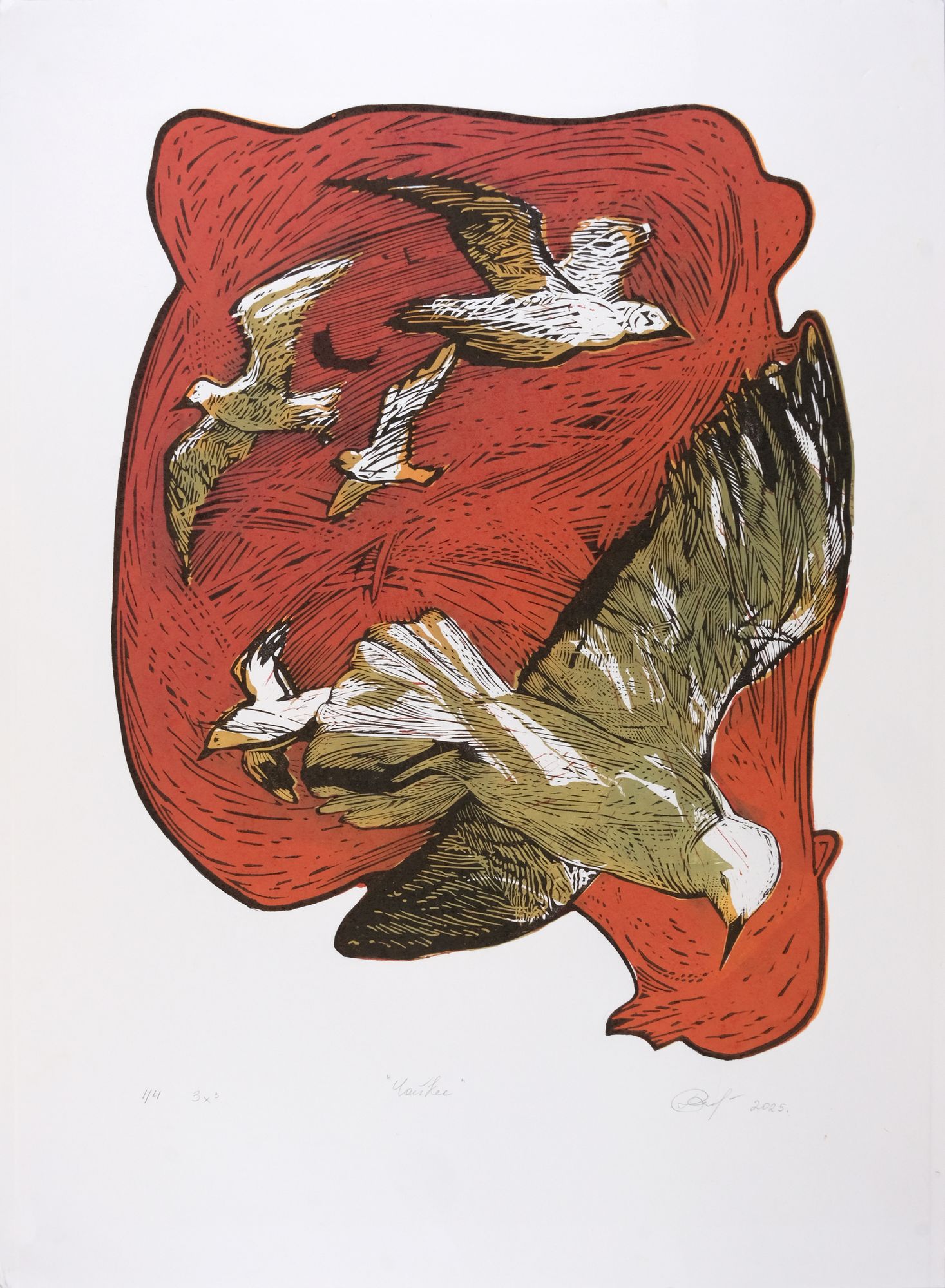 Линогравюра «Чайки» была выполнена художницей без предварительных эскизов под впечатлением от поездки к Балтийскому побережью. Ощущения свободы и полета — ключевые состояния, которые хотела передать Любовь Куриленко.