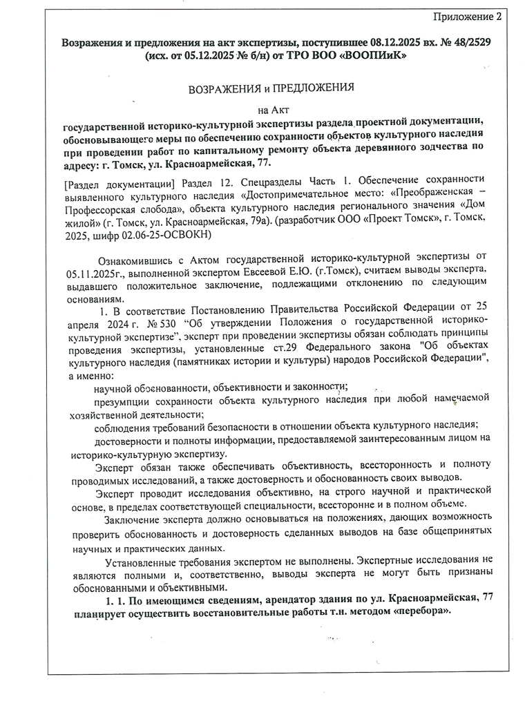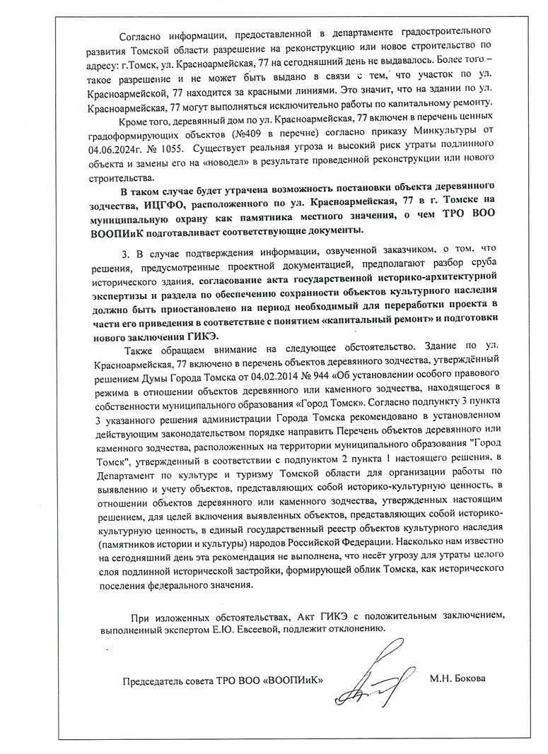 — На акт по Красноармейской, 77 мы подали официальное возражение, поскольку считаем, что метод перебора близок реконструкции, это уже не капитальный ремонт. И если говорить о реставрационных работах, то [программа] «Дом за рубль» у нас предполагает, что основная масса будет оставаться, основной процент аутентичных материалов. Здесь большой риск в том, что когда инвестор будет делать перебор, то он заменит цельнокованые брёвна на новые, и очень велика вероятность получить абсолютный новодел. А программа «Дом за рубль», в общем-то, не предполагает новоделов, а именно восстановление объекта, который там был и который имеет историческую достоверность. И поэтому для нас дорога первичная постройка. И хотя я вижу по экспертизе, что сохраняются габариты, но тем не менее, перебор подразумевает полную замену несущих конструкций. На реконструкцию совсем другой порядок действует: нужно получить разрешение уполномоченных органов, экспертиза должна проводиться как раз именно в отношении реконструкции, а не в отношении капитального ремонта, потому что там разные работы и разная степень процентного соотношения материалов остаётся. Самое главное, что эти понятия — реконструкция и капитальный ремонт — они разделены в Градостроительном кодексе, это совершенно разные категории выполняемых работ. И для них подразумевается совершенно разный порядок получения разрешений, уведомлений и так далее.— отмечает Бокова.