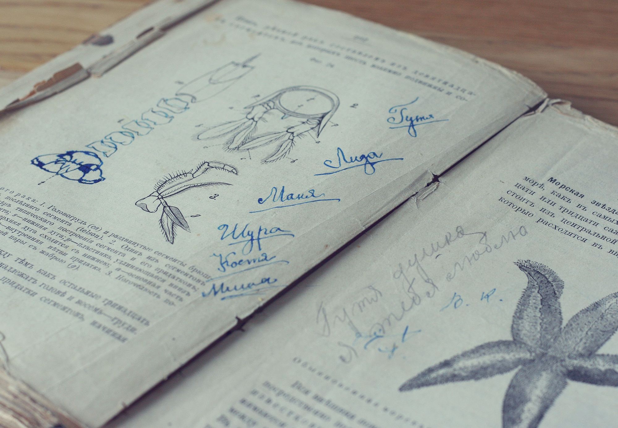 Но Гутя не только обсуждала на страницах книги своих друзей, иногда ей приходилось и учиться. Поэтому в учебнике можно найти пометки и пояснения к предмету. Одна из таких пометок — три загадочные буквы «д.с.п.». По словам Ирины, обычно эта аббревиатура встречалась перед названием очередного параграфа или началом абзаца. Вероятно, это сокращение от «для собственного пользования» — частую «канцелярскую» пометку того времени.