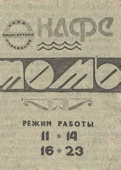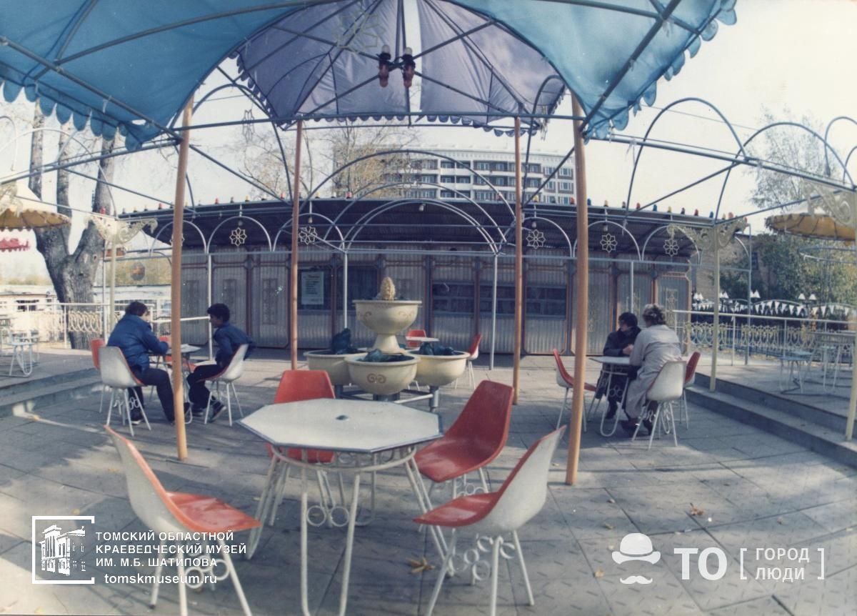 Первое из 40 кафе — «Томь» — открылось в Ленинском районе. Оно расположилось на прогулочной палубе здания у речного вокзала. За его обустройство было ответственно ремонтно-строительное управление (РСУ) Речпорта.